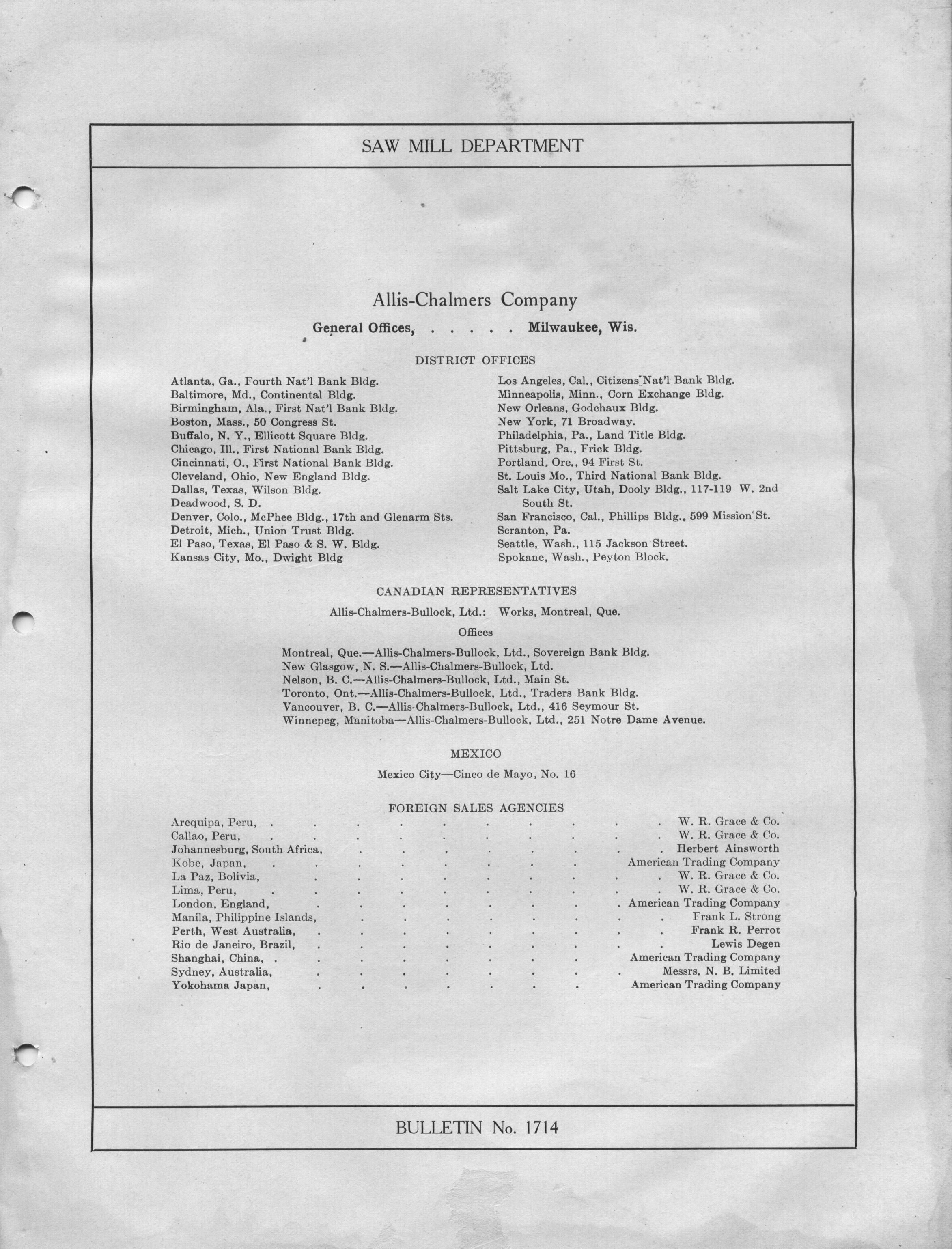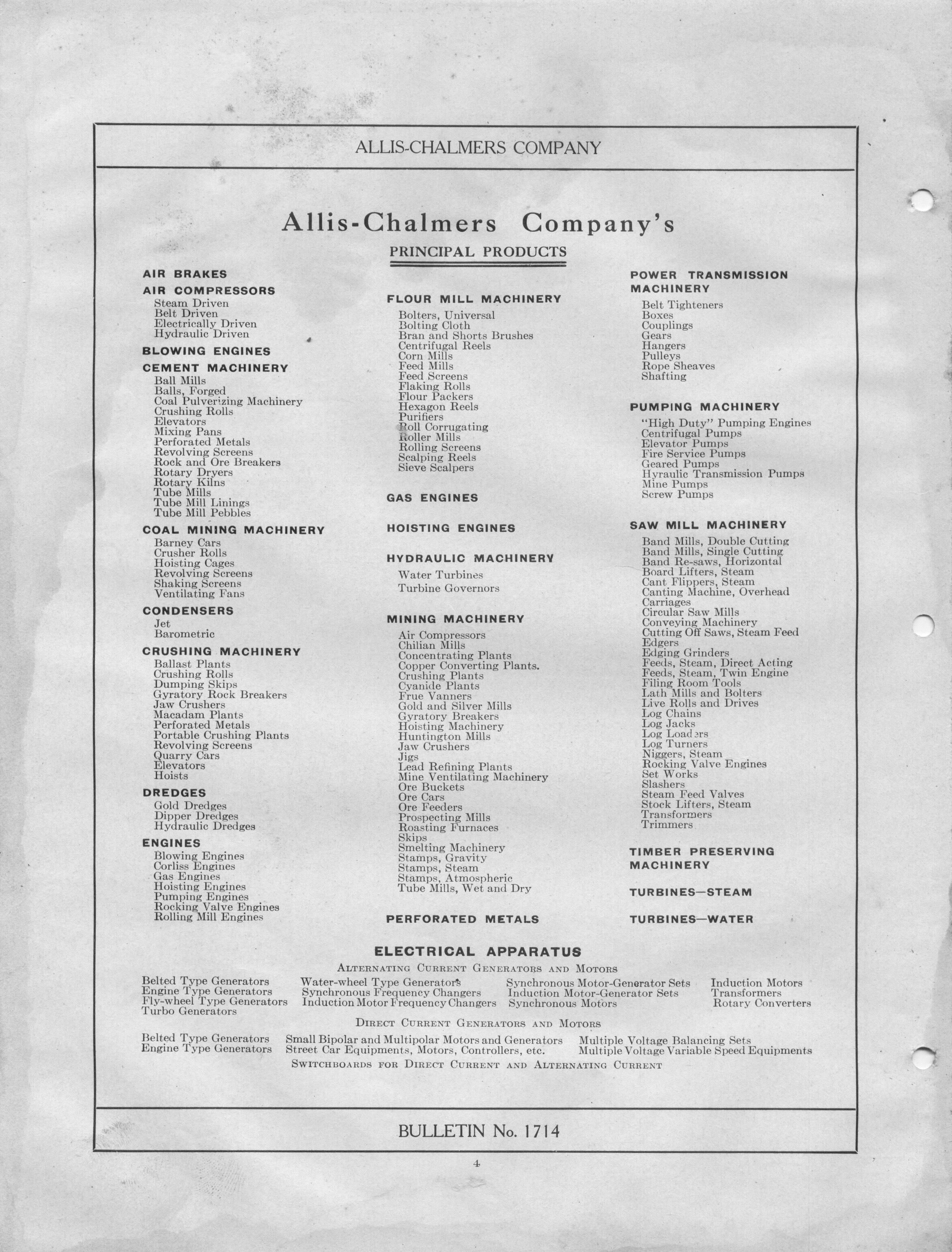 has equipment of air brakes, air compressors, blowing engines, cement machinery, chilled rolls, coal mining machinery, condensers, Corliss engines, crushing machinery, dredges, engines, electrical apparatus (alternating current, direct current, and switchboards for generators and motors), flour mill machinery, gas engines, hoisting engines, hydraulic machinery, mining machinery, perforated metals, power transmission machinery, pumping machinery, rolling mill engines, sugar machinery, sawmill machinery, steam shovels, timber preserving machinery, turbines-steam, and turbines-water