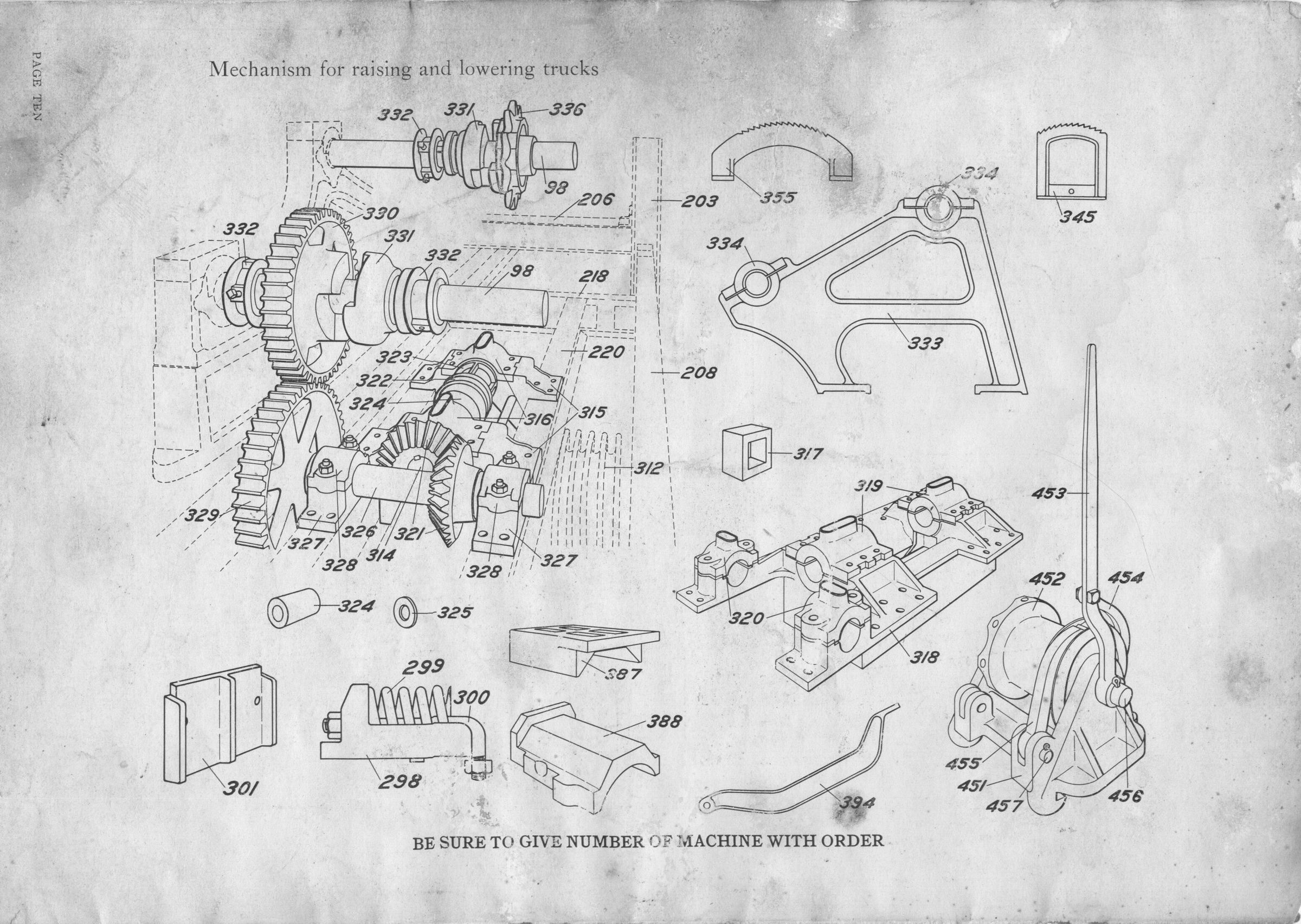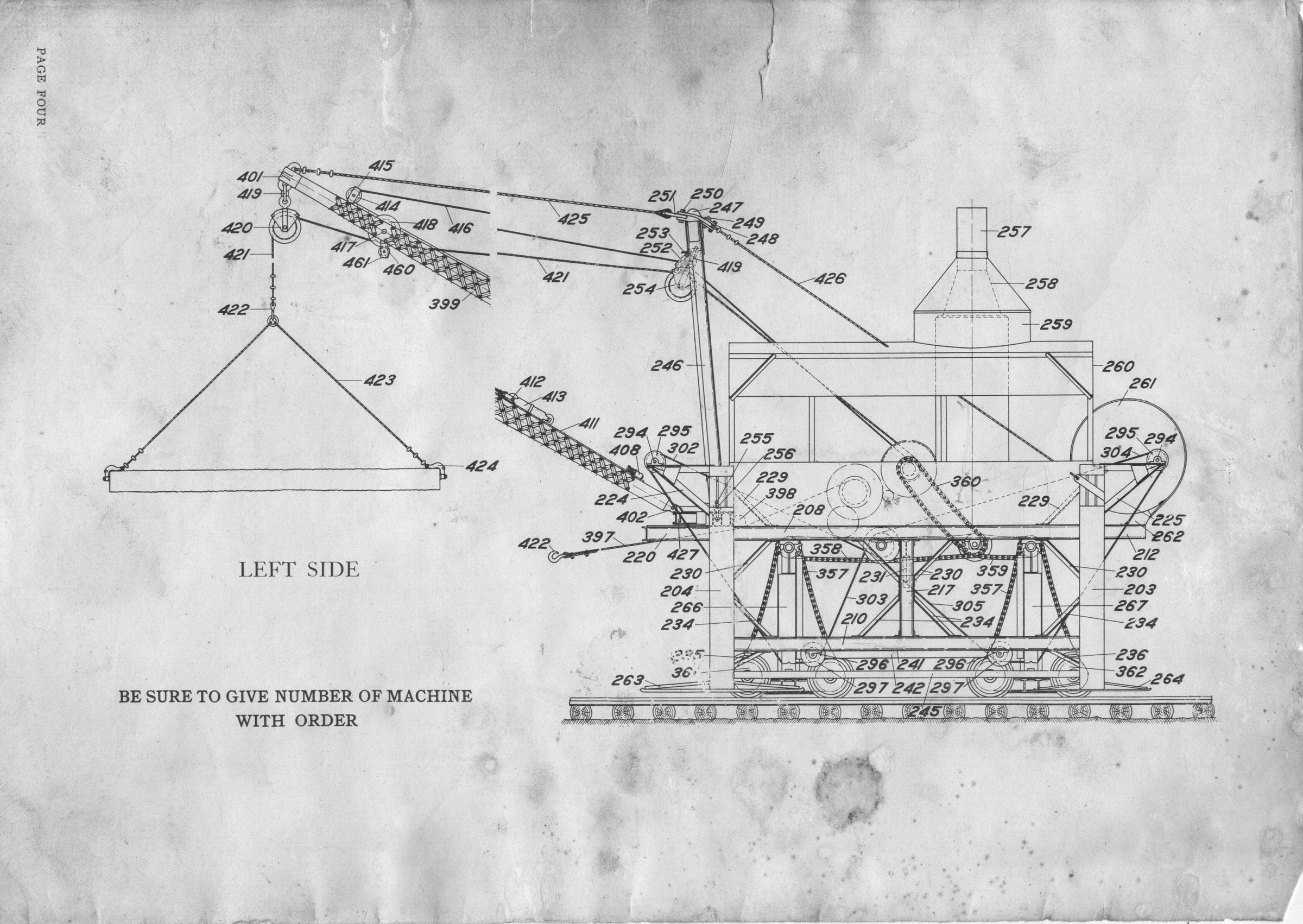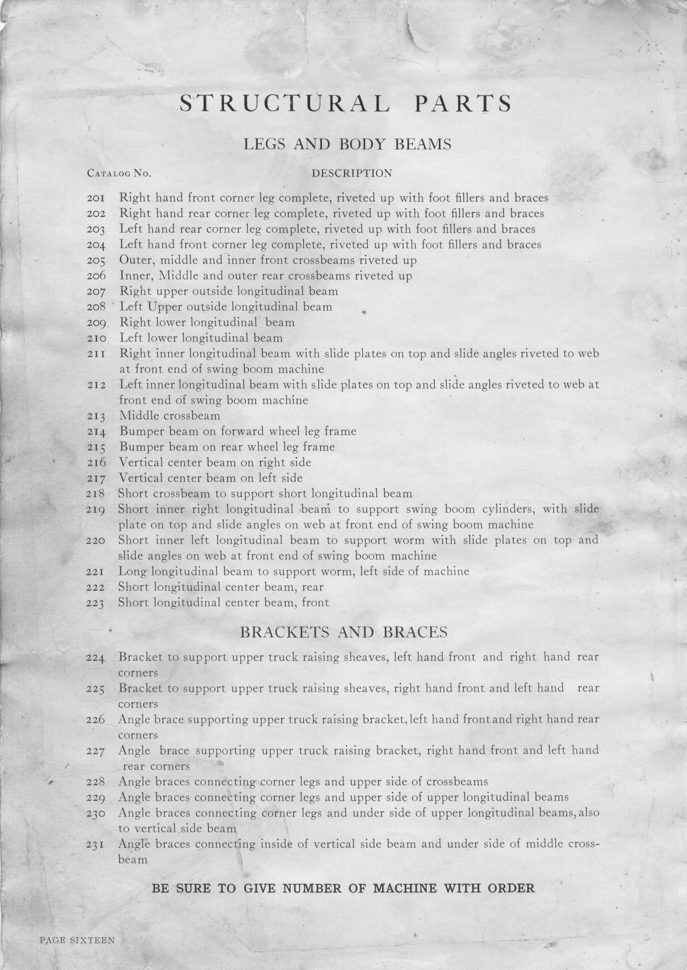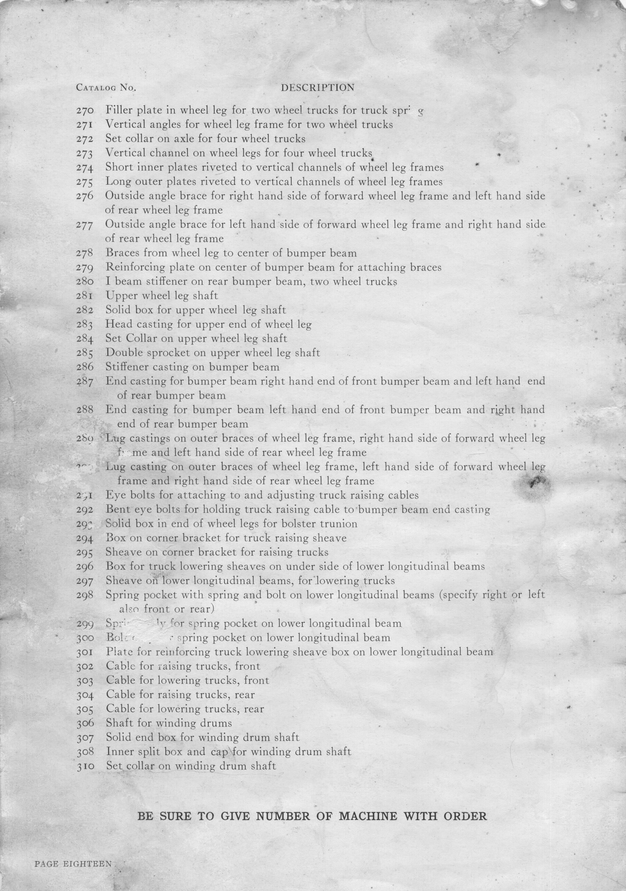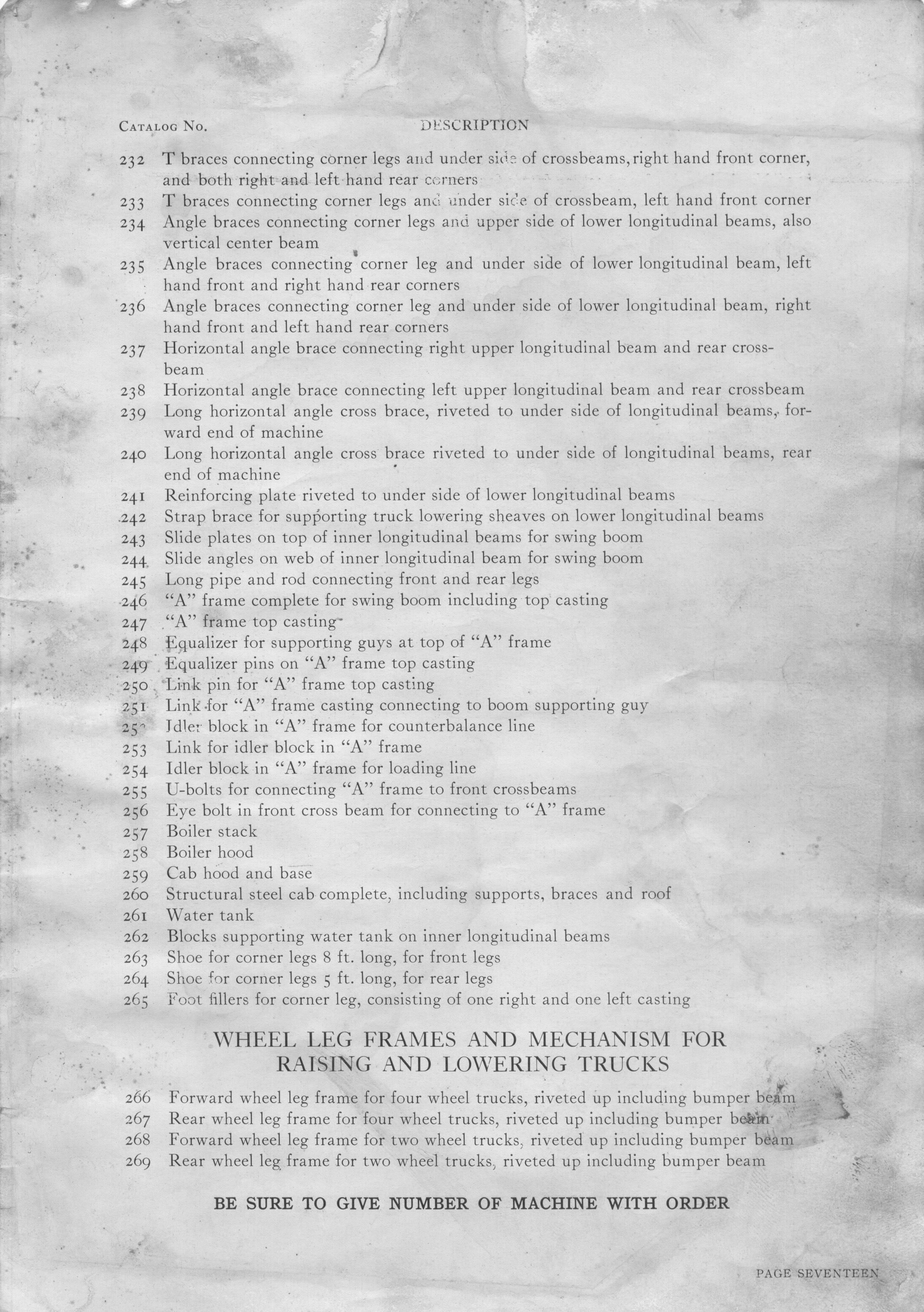 Out of New Orleans District; detail list to order for parts of the McGiffert Log Loader; engine parts; structural parts of the leg and body beams, and bracket and braces, wheel leg frames and mechanism fr raising and lower trucks, propelling and brake mechanism, trucks, boom and attachmentsContext