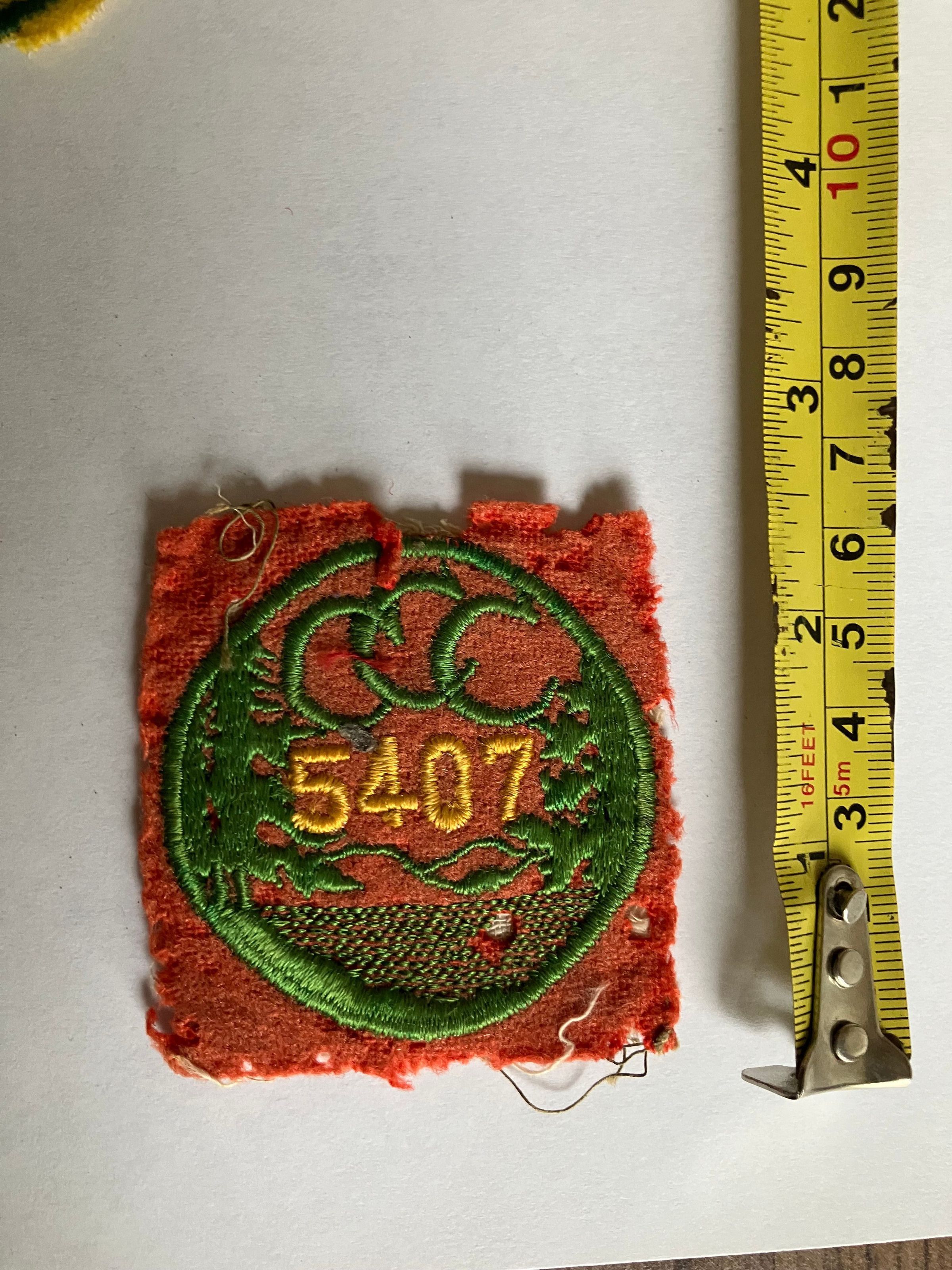 Square shaped red CCC Company 5407 patch with green silk embroidery and yellow silk embroideryContext