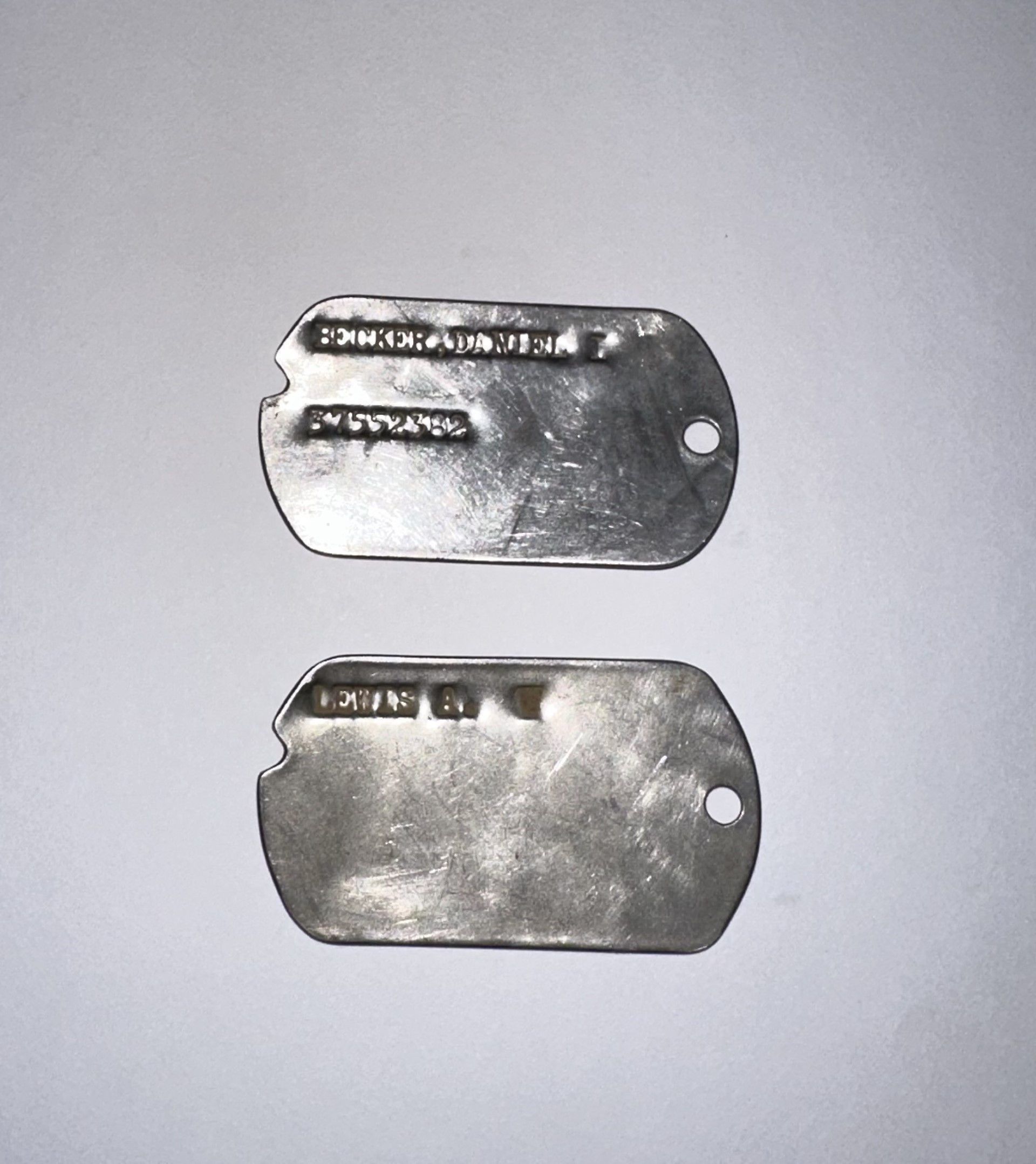 Two dog tags that were made at Camp Claiborne, LA that were discarded due to error.Context