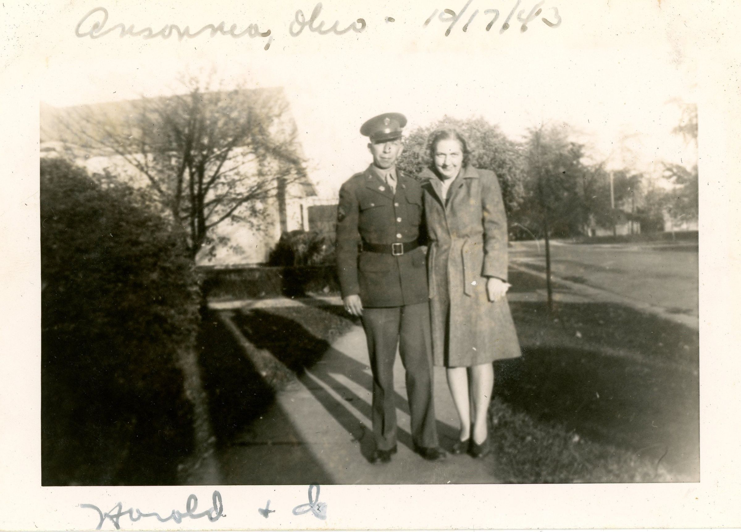 Photo of Harold Brock and "I" (thought to be Dorothy Brown) in Ansonia (misspelled Ansonnea), Ohio, on Oct. 17, 1943.Photograph Details