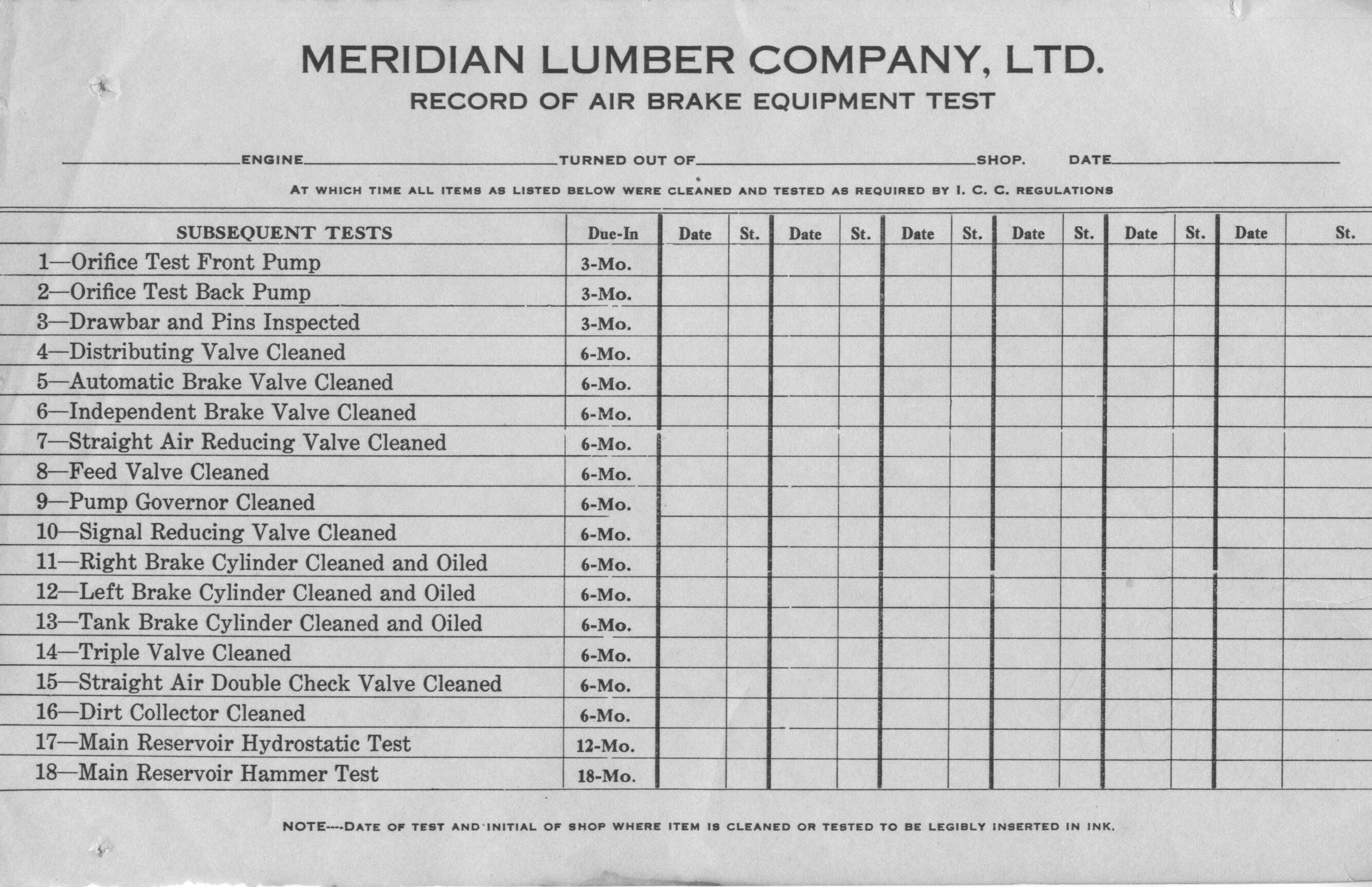 the items were to be cleaned and tested per the regulations of the Interstate Commerce Commission; items shown: orifice test front pump, orifice test back pump, drawbar and pins, distributing value, automatic brake calve, independent brake valve, straight air reducing valve, feed valve, pump governor, signal reducing valve, right and left brake cylinder, tank brake cylinder, triple valve, straight air double check valve, dirt collector, main reservoir hydrostatic and main reservoir hammerCreator
