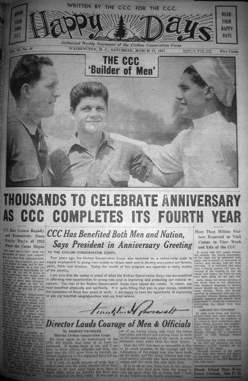front page; articles "The CCC: 'Builder of Men';" "Thousands to Celebrate Anniversary as CCC Completes Its Fourth Year"Context