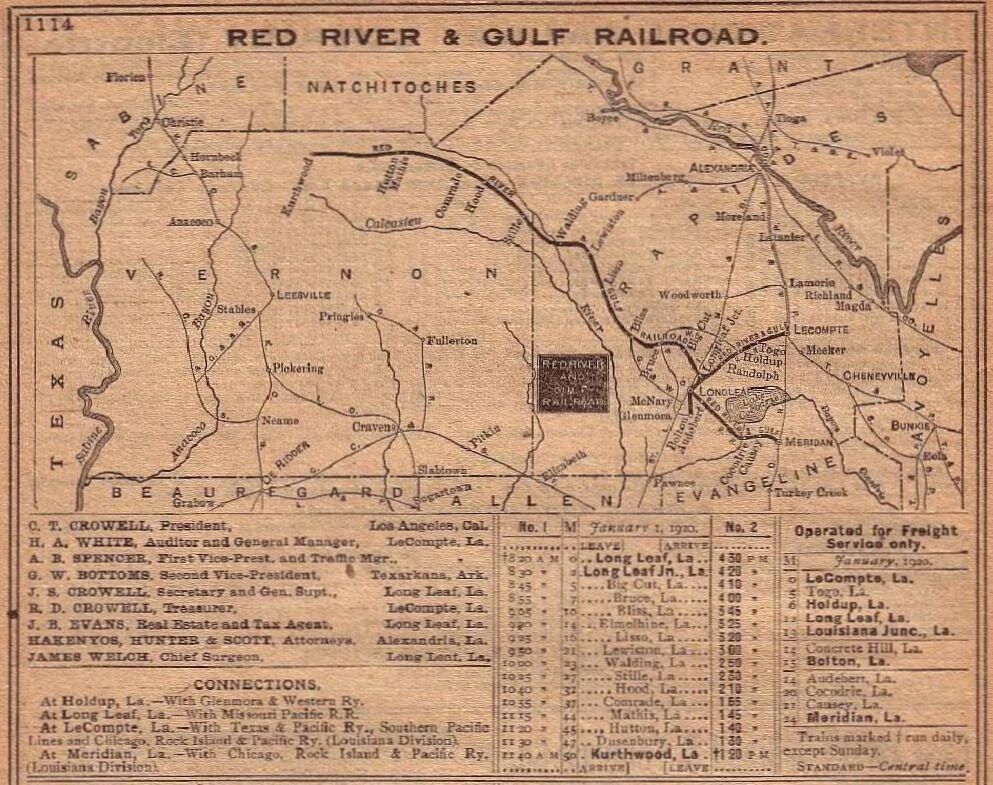 the officials in 1920 were C. T. Crowell president in Los Angeles, H. A. White auditor and general manager in Lecompte, A. B. Spencer first vice president and traffic manger in Lecompte, G. W. Bottoms second vice president in Texarkana, J. S. Crowell secretary and general superintendent in Long Leaf, R. D. Crowell treasurer in Lecompte, J. B. Evans real estate and tax agent in Long Leaf, Hakenyos, Hunter & Scott attorneys in Alexandria, and James Welch chief surgeon in Long Leaf;