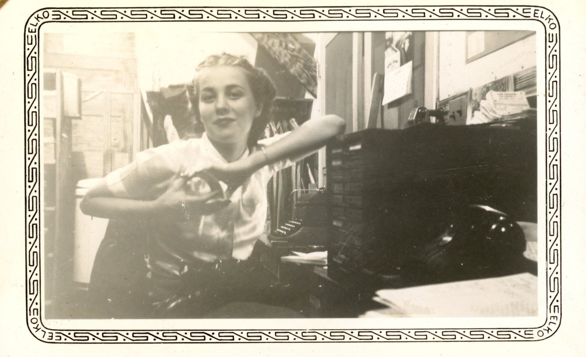 Various individuals contributed to the function of Camp Claiborne such as the woman depicted above. It can be assumed that she handed correspondence, as gathered from the workstation presenting a telephone, parchment, and envelopes.Collection