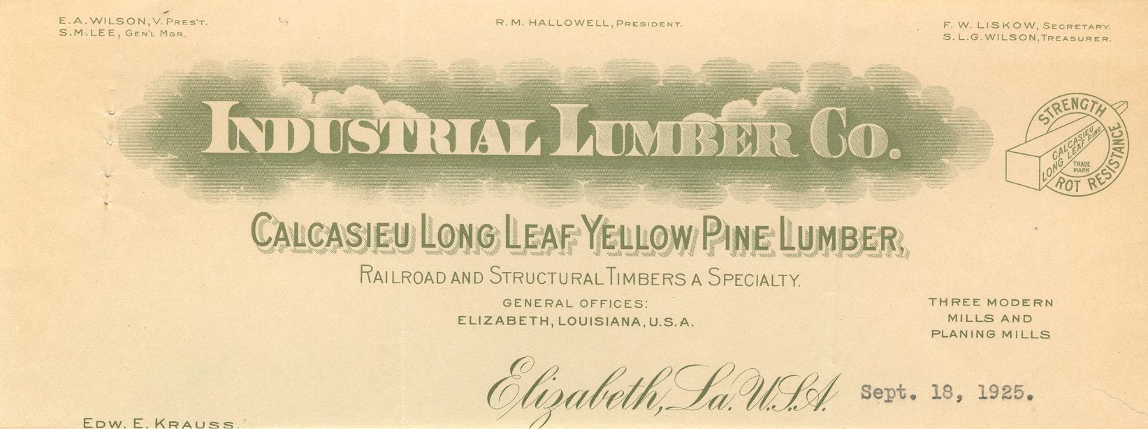 Industrial Lumber company began operations in Elizabeth, Louisiana. The company focused on the production of Railroad and Timber products. However, the company was forced to shut down due to local resources drying up.Collection