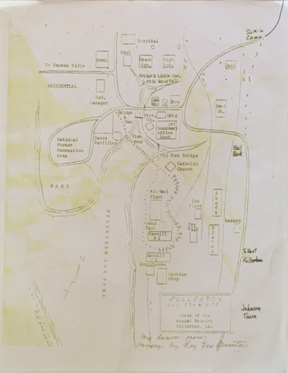 A hand drawn map of the Fullerton Old Town Site, which is the scene of the annual reunion in Fullerton, LA. The map was hand drawn from memory of Ray Van DeventerContext