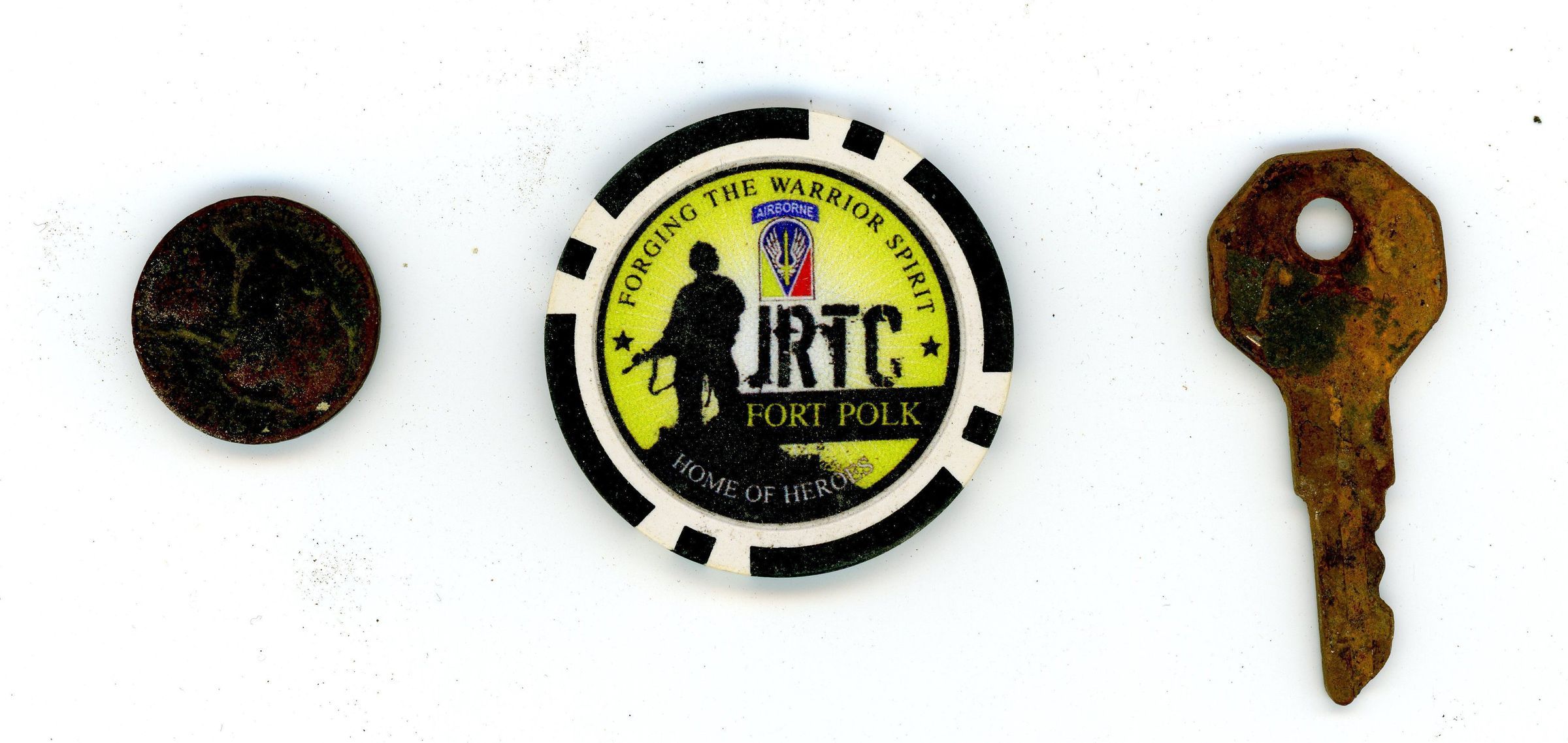 A penny, token of excellency, and a key from the Fort Polk campsite.Context