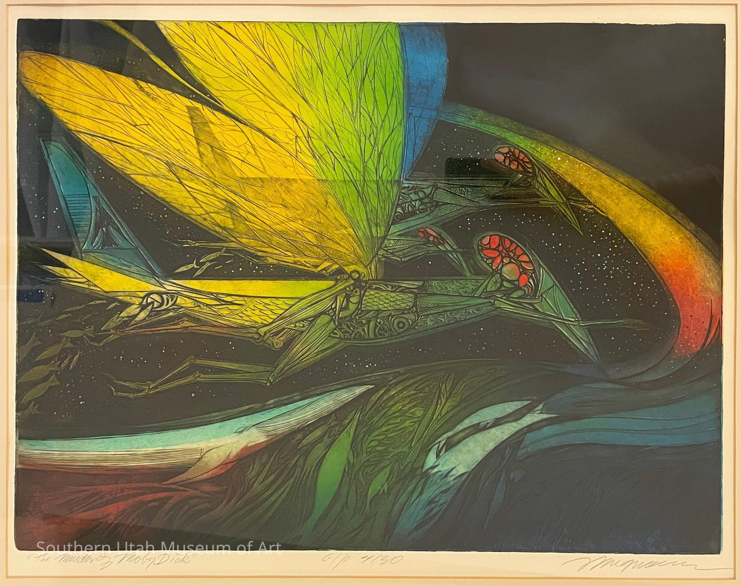 Joseph Mugnaini collaborated with one of the greatest science fiction writers of the 20th century, Ray Bradbury, who authored such classics as "The Martian Chronicles," "Fahrenheit 451", and "Something Wicked This Way Comes." The writer and the artist met in Los Angeles in 1952 and quickly began collaborating on projects. Mugnaini went on to illustrate many of Bradbury's works, including "Fahrenheit 451" and "The Martian Chronicles." Later that year Bradbury took on a project in Ireland for director John Huston to write the screenplay for the film "Moby Dick," which took him all of 1953 and half of 1954 to finish. Bradbury published his experiences in "Green Shadows, White Whale." Inspired by his friend's work on "Moby Dick," Mugnaini created this color-mixed intaglio print depicting a scene in the story. It shows a pair of colorful, winged, predatory mantis-like creatures swimming through the sea as the great white whale's bloodstained body drifts in the seaweed beneath them. A pair of porpoises are in attendance. A line of rainbow color winds upward, possibly to Ahab's entangled body.
