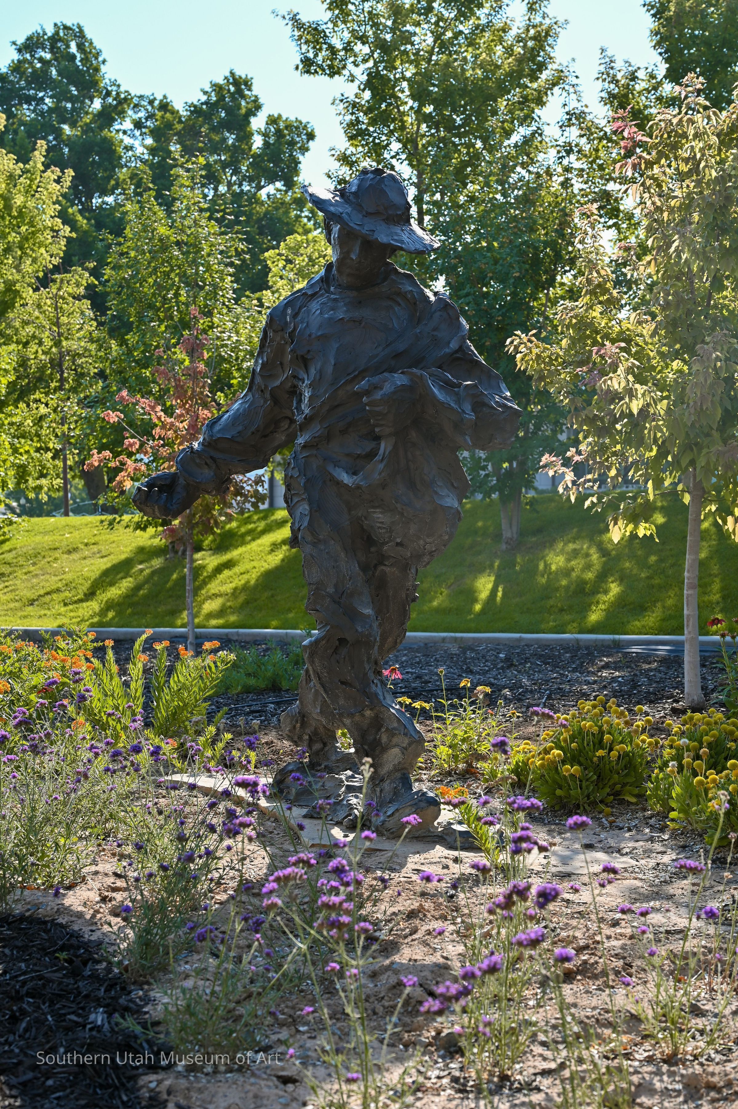 Growing up on a farm, much of her work reflects on her connection to nature. DeDecker manipulates her clay with a painterly style leaving brush marks over the surface to emulate movement and fluidity. A reflection of her potential influences, The Sower evokes the work of important artists from two very different periods and movements: Vincent Van Gogh and Italian Futurists, such as Umberto Boccioni. Like DeDecker, Van Gogh was inspired by the rhythmic cycles and honorable traditions of agricultural life, and thus employed a farmer spreading seeds as a subject in multiple works. The sowers in DeDecker’s and Van Gogh’s works are frozen in this distinctive action, which has become a rather iconic pose. While the surface of DeDecker’s sculptures mirrors the brushwork of Van Gogh’s paintings, the texture evokes a sense of suspended motion. The Italian Futurists were obsessed with the modern technology and mechanisms developing with speed during the early twentieth century. In an attempt to capture the dynamism of a body in motion, Boccioni sculpted human forms as if the full range of their movement was captured in a solid blur. DeDecker similarly uses the solid materials of her sculpture to depict the body of The Sower as if his clothes are blowing in the breeze or shifting with his efforts, leaving a fluid trail of his actions.