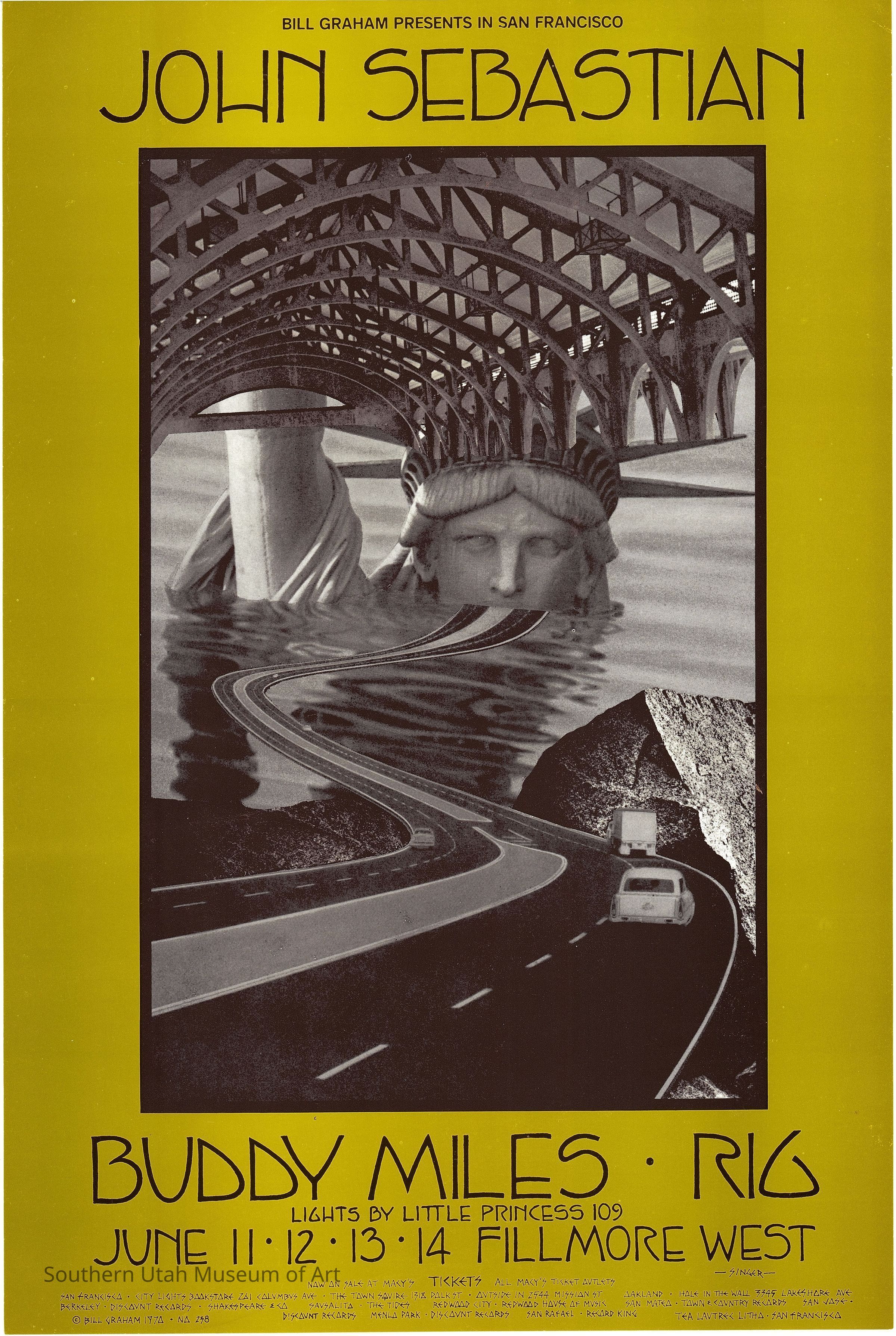 Across David Singer’s body of work, there is a pattern of relating his designs to the themes explored in the work of the musicians his posters are promoting. John Sebastian's songwriting, for example, includes American roots in music, as well as social and environmental activism. In this piece, Singer is inspired by the aesthetic and message of the performer, presenting his own visual interpretations of his music, creating surreal imagery that engulfs the viewers full attention, as the Statue of Liberty is being literally engulfed by the landscape—perhaps a reflection of John Sebastian's critique of American society and democracy.Label Type