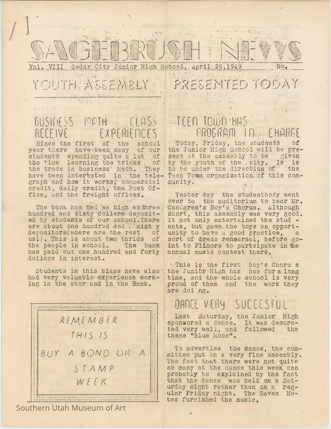 "Sagebrush News"; a newsletter from Cedar City Junior High School dated April 29,1949. It contains work by Class Reporter Jeanne Jones; was kept by Jim Jones' mother, Thelma, in the scrapbook she kept of the artist's early work.Collection