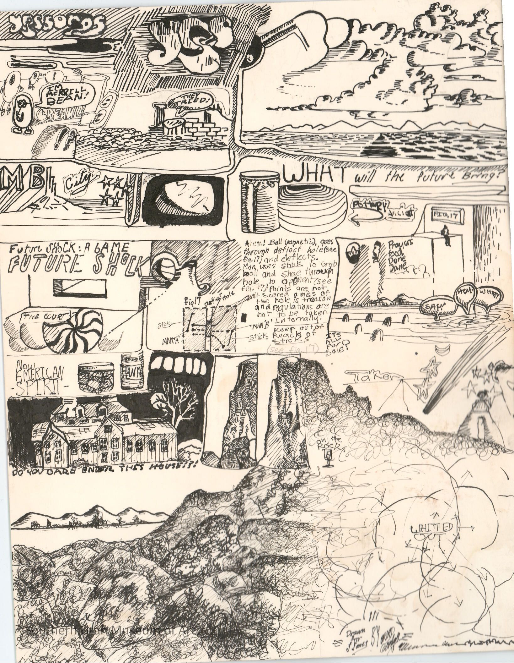 An ink drawing by Brad Gordon for Jim Jones. Drawing is part of a folder that was kept with the Jim Jones Scrapbook featuring artwork by students taught by Jim Jones.