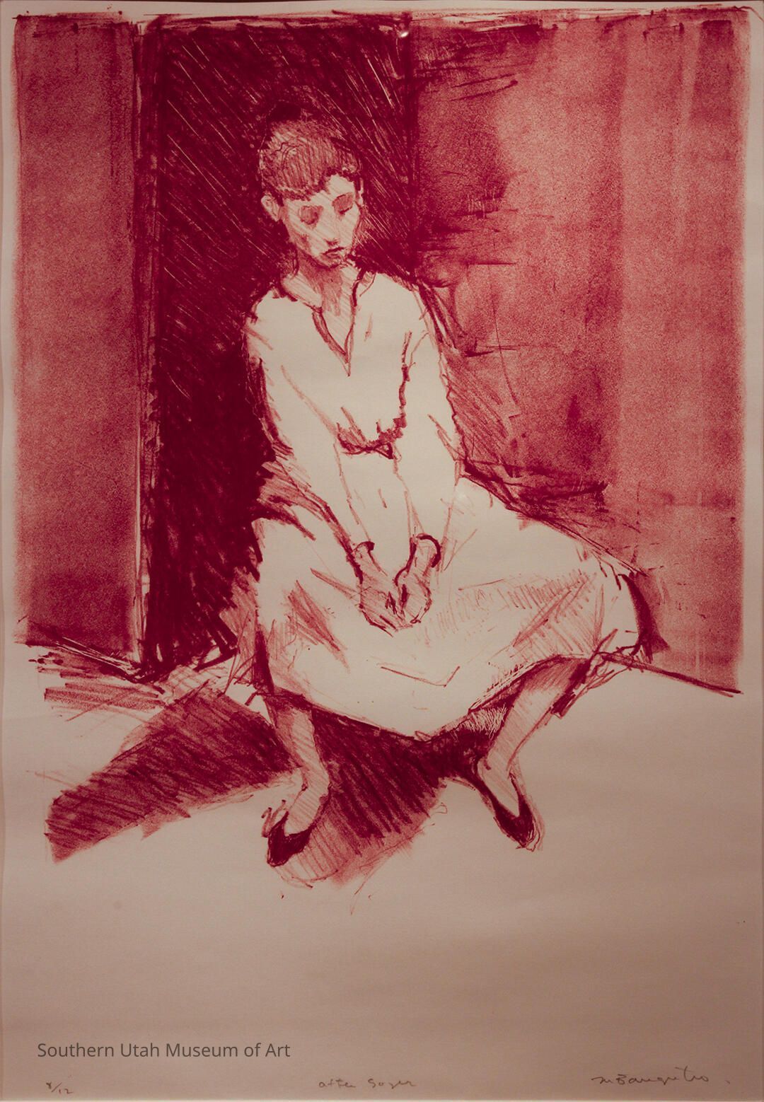 Mark Bangerter's subjects, style, and other distinctive characteristics of his works of art are best known for his feverish or featherish brush strokes. Most of Bangerter’s works of art are portraiture, landscapes, nudes, and street scenes, while quite a few look to be in a futuristic style of his own. After returning from traveling and painting abroad in Russia, the Czech Republic, and Germany, Bangerter was attacked by a man one evening in April 1998 in an Idaho club. Calling it "an unlucky encounter," the artist had to undergo several reconstructive surgeries and was been blind in one eye for the rest of his life. He turned to filmmaking for a while and made several short films in black and white. About a decade after that fateful night, Bangerter once again picked up the paintbrush and began painting in a more abstract style with strong colors. This particular print predates his accident and reflects his earlier, lighter style. It shows a portrait of a woman seated in quiet contemplation, with delicate and airy brushstrokes that express his pre-accident technique. The work stands in contrast to the abstract, color-driven approach that defined Bangerter's later years.