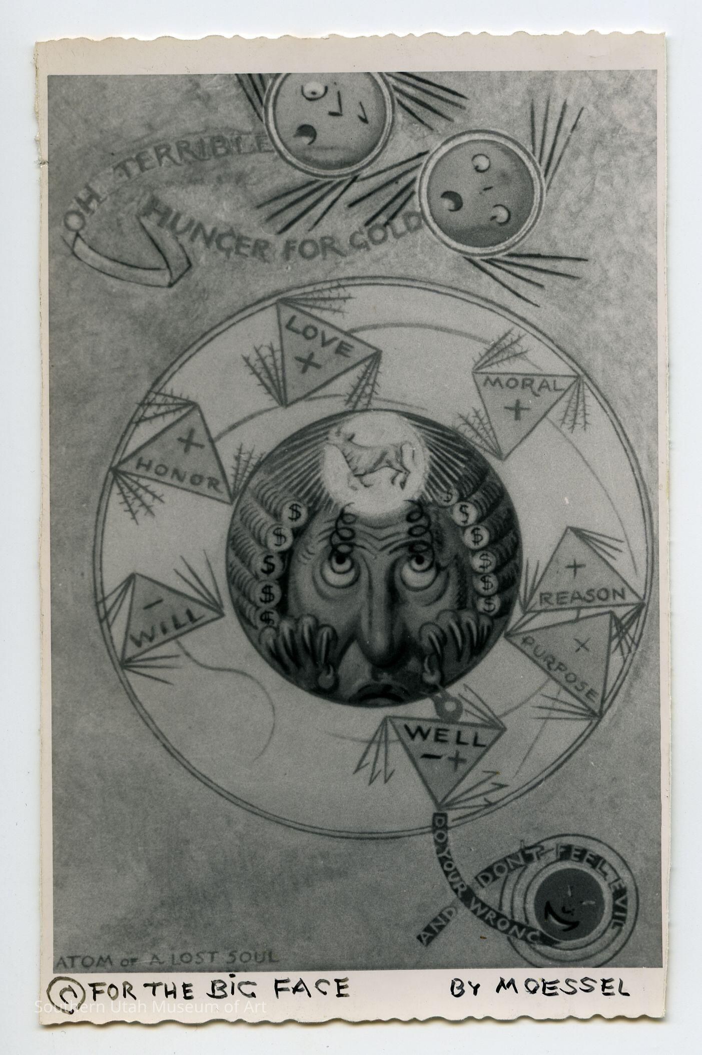 "Atom of a Lost Soul" is the anatomy of the greed he painted in his many paintings like "Blind Providence." In this piece we see a man tempted with money, surrounded by benevolent morals which he looks past to fix his eyes on the “terrible hunger for gold” that looms above. Below him are the words “do your wrong and don’t feel evil,” which further represents the deterioration of his morals into self-serving justification.