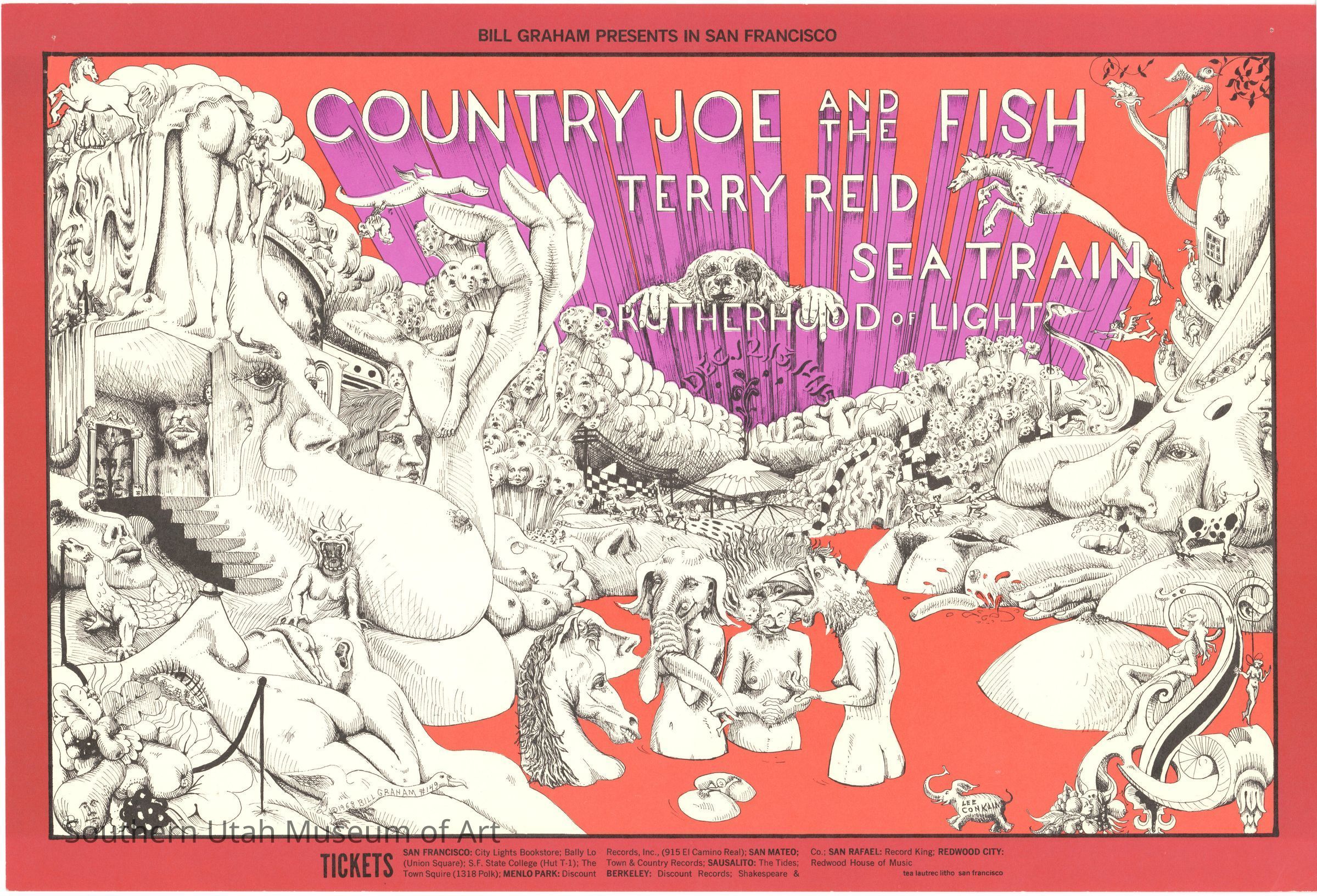 Lee Conklin is best known for the posters he created for Bill Graham’s rock and roll concert venue, the Fillmore West. Every poster artist in San Francisco wanted to work for Graham, so in February 1968, Conklin decided to try his luck and took a portfolio of his drawings into Graham’s office. Thankfully for Conklin, Graham liked his work, which uniquely takes bizarreness to an extreme, and gave him the job. His work builds upon the Fillmore’s poster artists before him, creating designs that are weird, mind-bending, and heavily influenced by his experiences with psychedelic drugs.Label Type