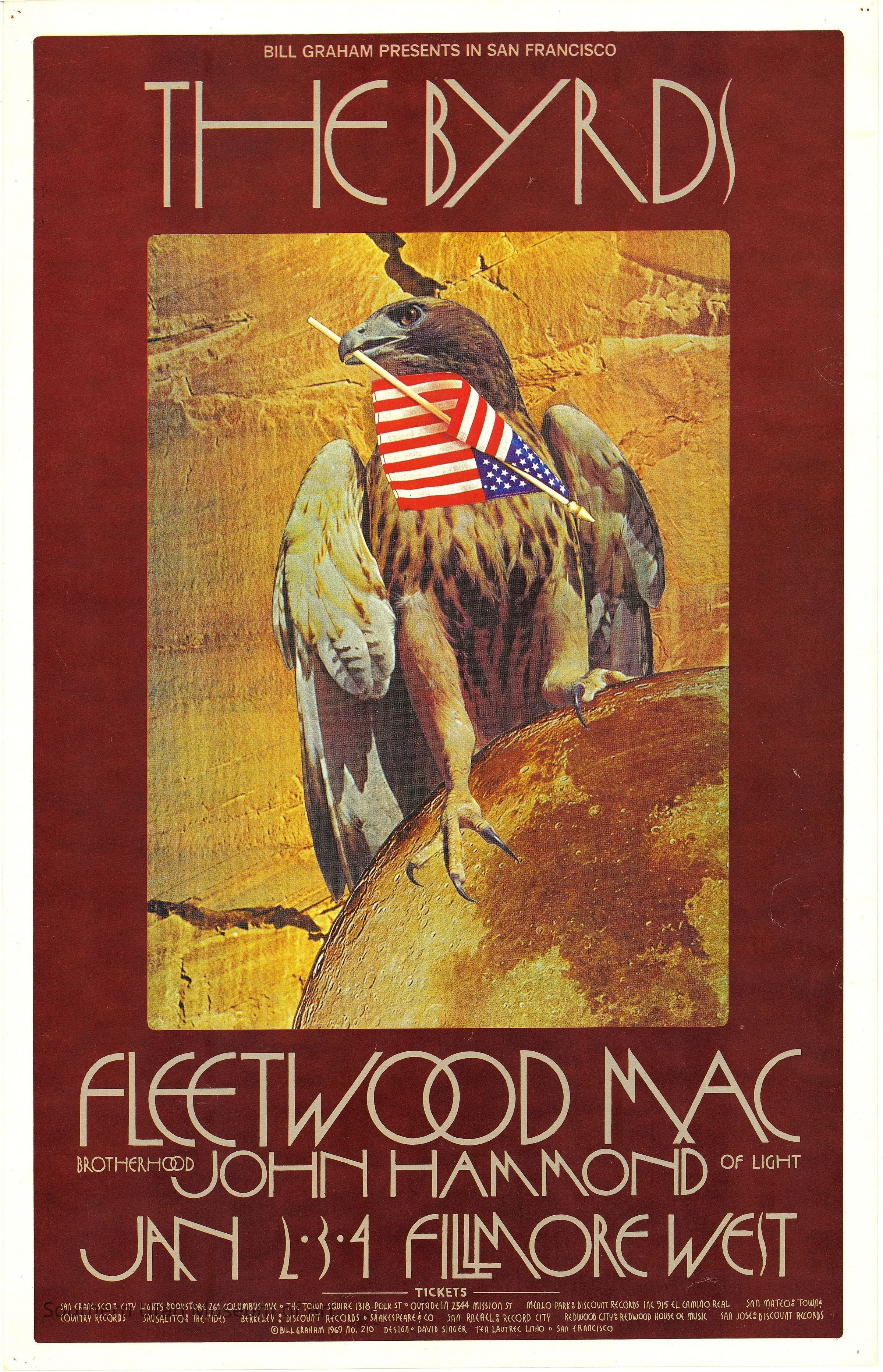 The Byrds and Fleetwood Mac were each famous for singing about topics such as the changing world, the counterculture movement, and Christianity. All of these are represented in this poster by David Singer through his chosen imagery. The most symbolic element in this piece would be the hawk, as it holds many meanings, such as strength, grace, connection to the divine, and the transmission of spiritual messages. Holding the American flag in its beak, it carries the message of a changing world in American history during this time of great society turbulence. David Singer continued to create artworks that played as a form of contemporary propaganda such as this photomontage piece.Label Type