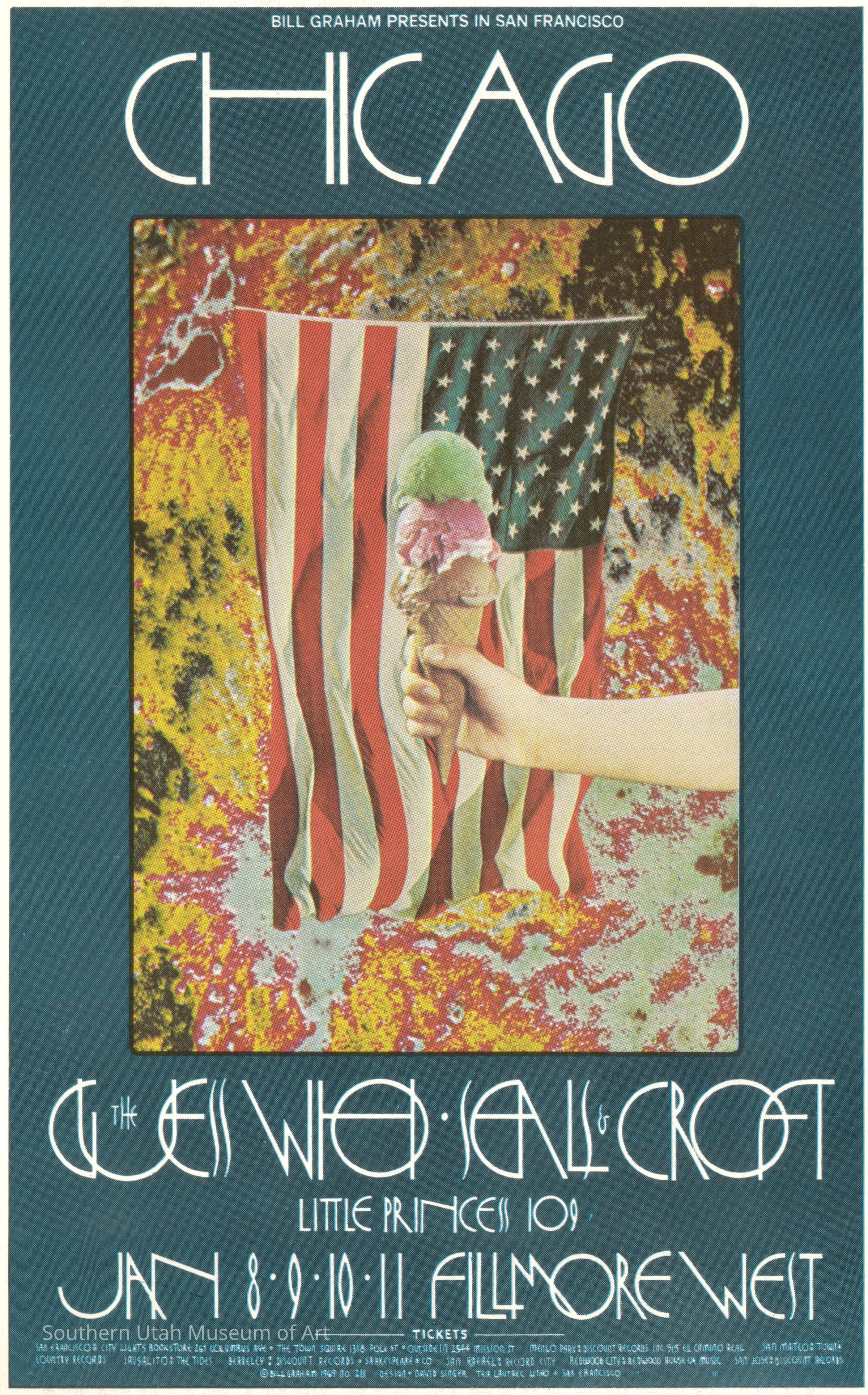 In the late 1960s, the Vietnam War was escalating, and anti-war protests were causing low morale for the troops abroad and those who had returned. This photomontage poster was created during the height of political and societal tension. David Singer's choice of imagery acts as a form of contemporary propaganda and commentary. The ice cream cone is a symbol of morale for troops, originating in WW2. This image goes hand-in-hand with the American flag, which represents the core values of democracy. What stands out against these two is the psychedelic background of bold colors and fluid forms. The combination of these pieces may perhaps represent the merging of the counterculture of the 1960s and 1970s into what was considered traditional, defining the new generation of America while still acknowledging those roots. Label Type