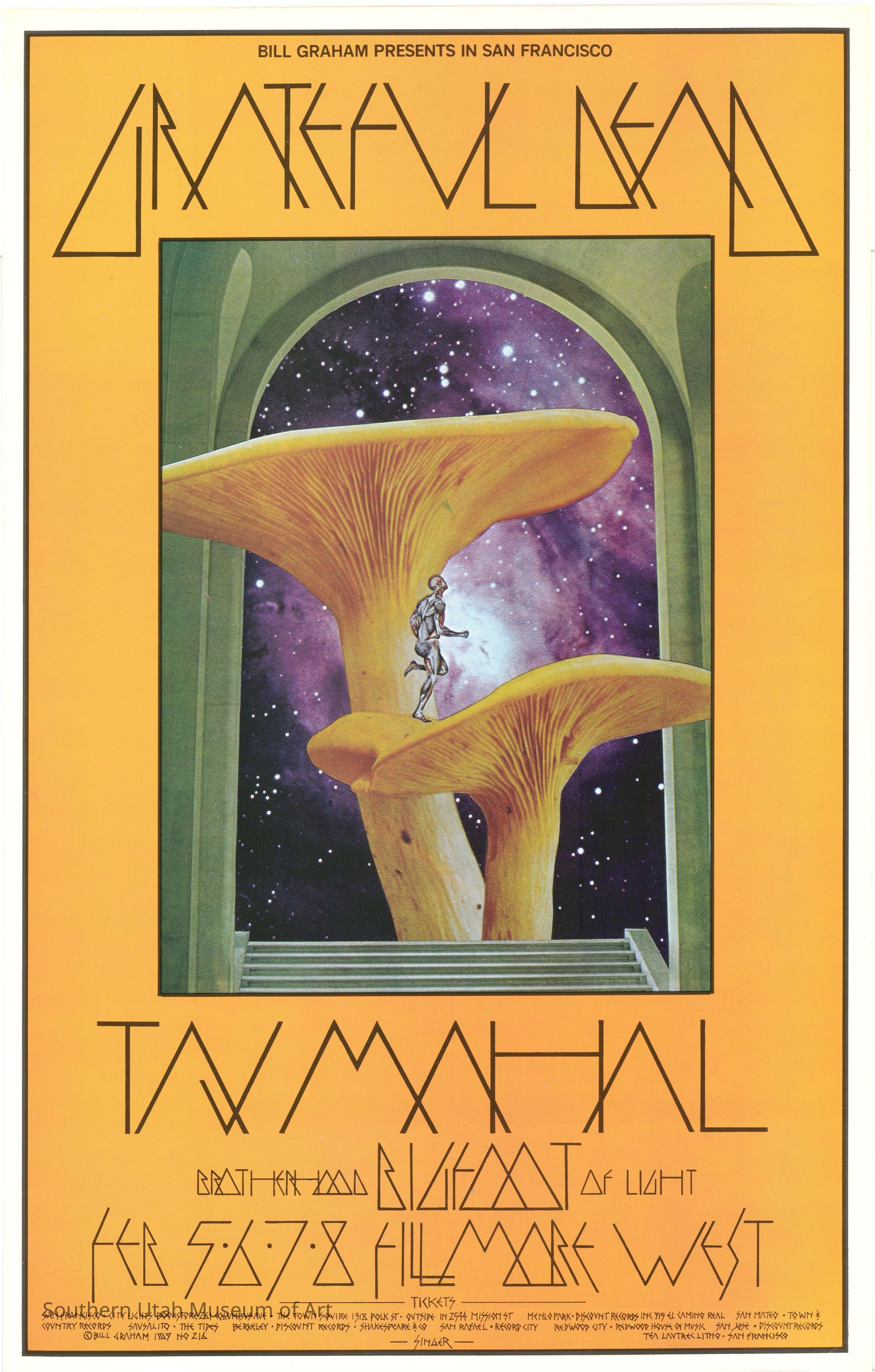 Prior to his involvement with the Fillmore West, David Singer was experimenting with collage art: physically cutting, pasting, and arranging images together to create scenes with symbolic imagery. He used these skills in this poster, where he’s created a collage of a human anatomical figure running on top of mushrooms, with a backdrop of a galaxy contained within a stone archway. It’s the sort of scene you might see in a strange dream; Singer himself described this poster as having “...a certain LSD mystique.”