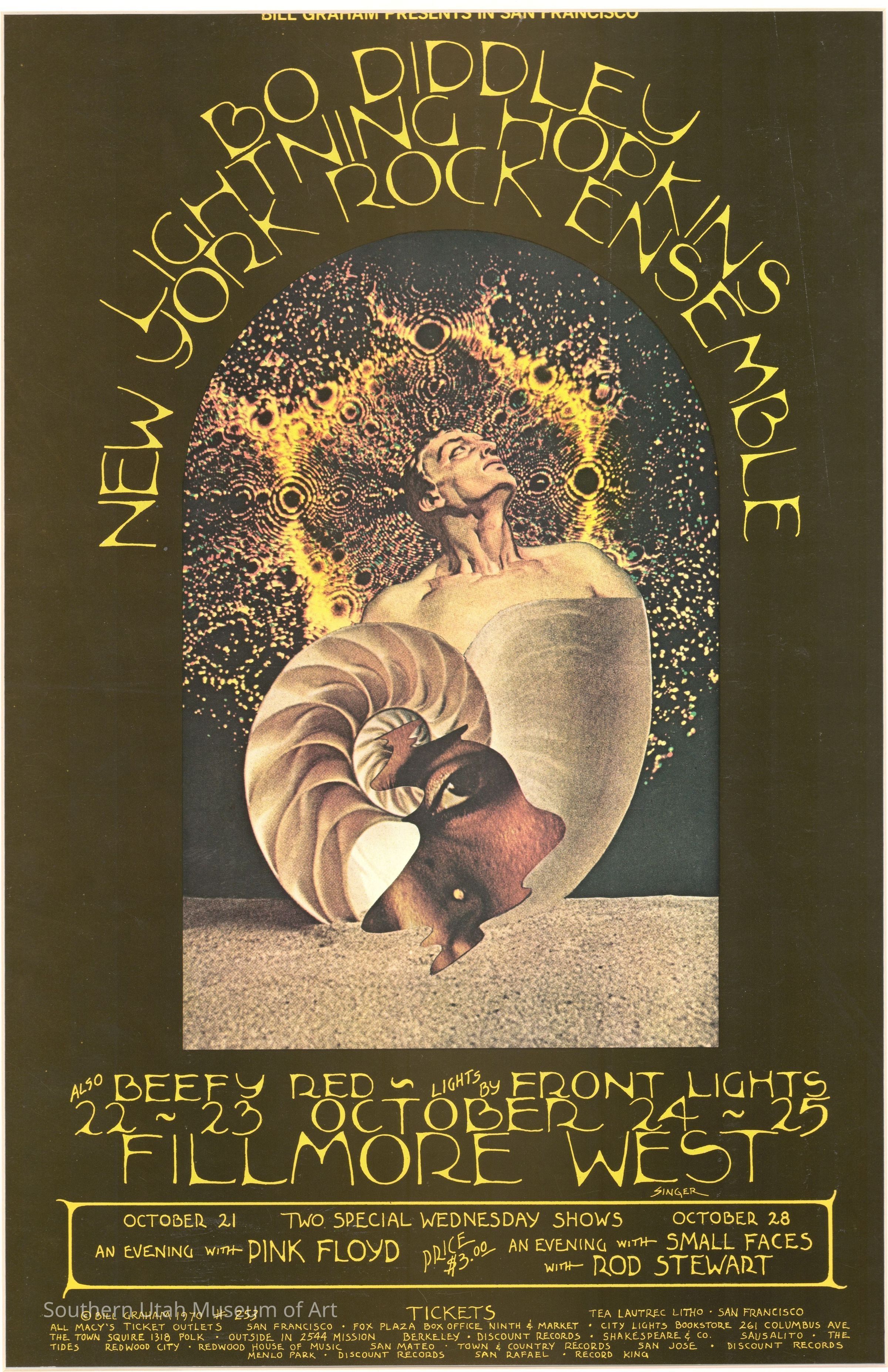 David Singer was born and raised in Quakertown, Pennsylvania, surrounded by the Pennsylvania Dutch culture. He was exposed to very intricate folk art, and David Singer gravitated towards it. From an early age, Singer was very creative, and artistically gifted. After he graduated high school, he enlisted in the Navy and served until 1964, then settled in San Francisco. After working many odd jobs, Singer found himself meeting with Bill Graham, the founder and promoter of the iconic Fillmore West music venue, to review his portfolio. After twenty minutes of silently studying Singers’ work, Graham immediately commissioned Singer to create twelve new posters. This launched his career with full force—David Singer was commissioned the most work out of all of the iconic Fillmore West Rock poster artists, creating a total of sixty posters for Bill Graham between 1969-1971.
