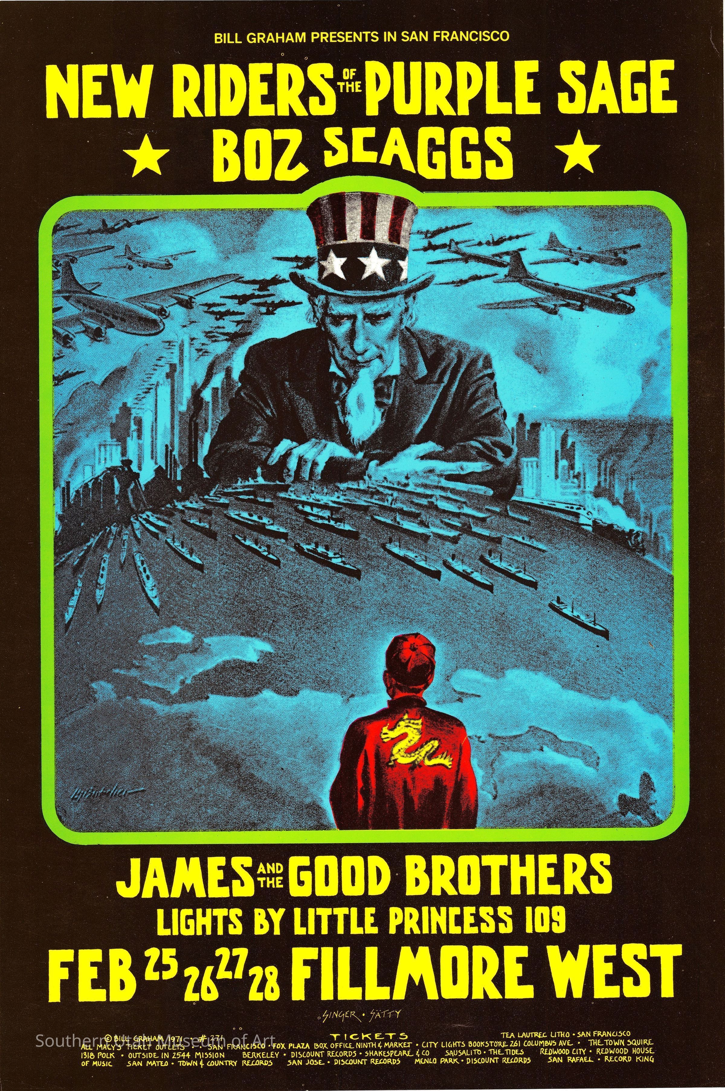 After leaving the Navy and settling in San Francisco, David Singer supported himself with odd jobs and began experimenting with graphic art and collage. In 1968, he was encouraged by a fellow poster artist to visit the office of Bill Graham, the director of the Fillmore West concert venue, where he was offered a job. Singer’s work was a significant shift from the work of previous artists because his designs were more simple and readable, incorporating collage techniques and surrealist influences. Of all the artists, Singer produced the largest body of work for the Fillmore, creating sixty posters between 1969 and 1971.Label Type