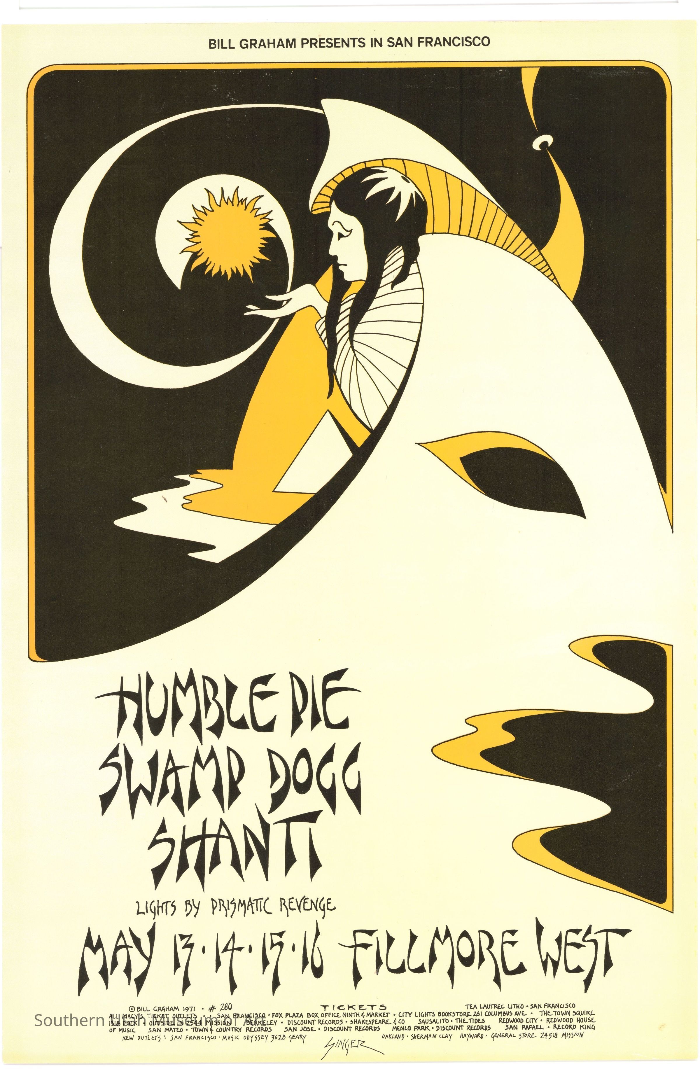 In his initial interview with Bill Graham, Graham asked Singer if he could do lettering. Singer said, “Sure,” even though he had no experience. He figured it out, and Graham immediately liked his style because it was easy to read. At this point, the novelty of barely-readable typography had worn off and people were ready for something new. The lettering on this poster is reminiscent of "chop suey" fonts, which are stereotypically associated with Asian cultures.
