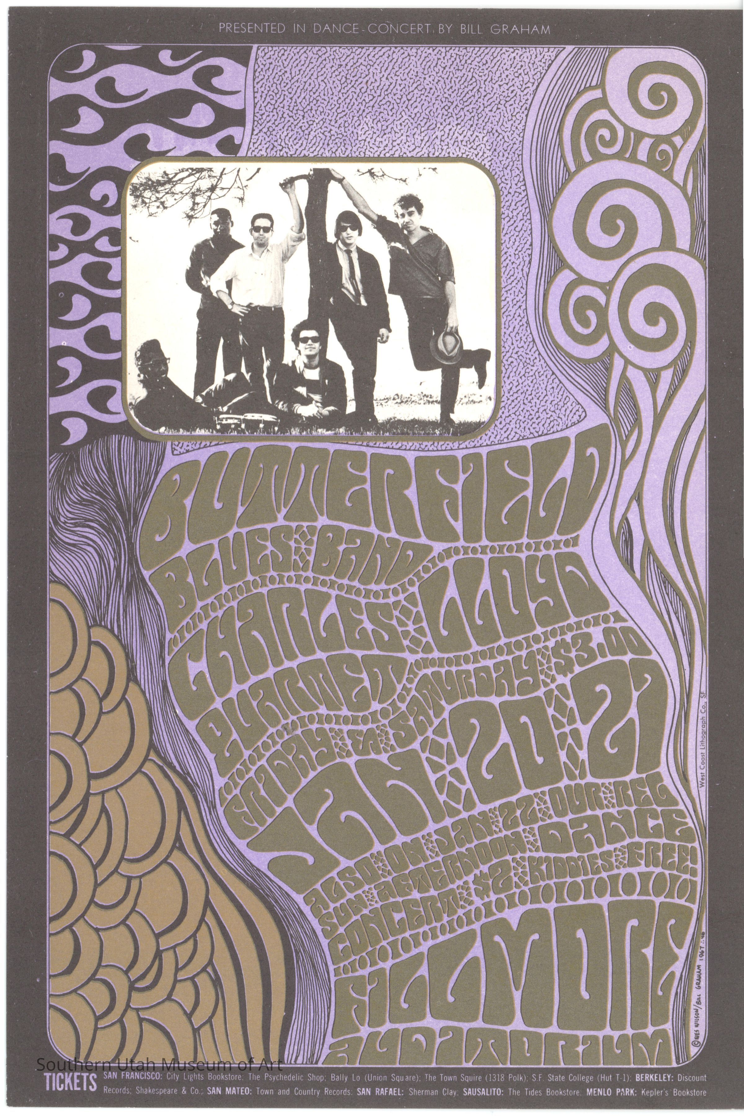 When the Fillmore Auditorium in San Francisco came under the direction of Bill Graham in 1965, Graham approached Wes Wilson to design the posters and handbills for shows and events. They met while Wilson was working at a small press operation that created promotional handbills for another project Graham was involved with. Working for Graham, Wilson helped develop an art style that perfectly encapsulated the psychedelic experience. Swirling, exaggerated typography and vivid colors immediately called out to the community that Graham wanted at his dance concerts. Wilson’s style is heavily influenced by the Art Nouveau movement: graceful lines, beautifully contrasting colors and women with flowing hair dominate his designs.Label Type