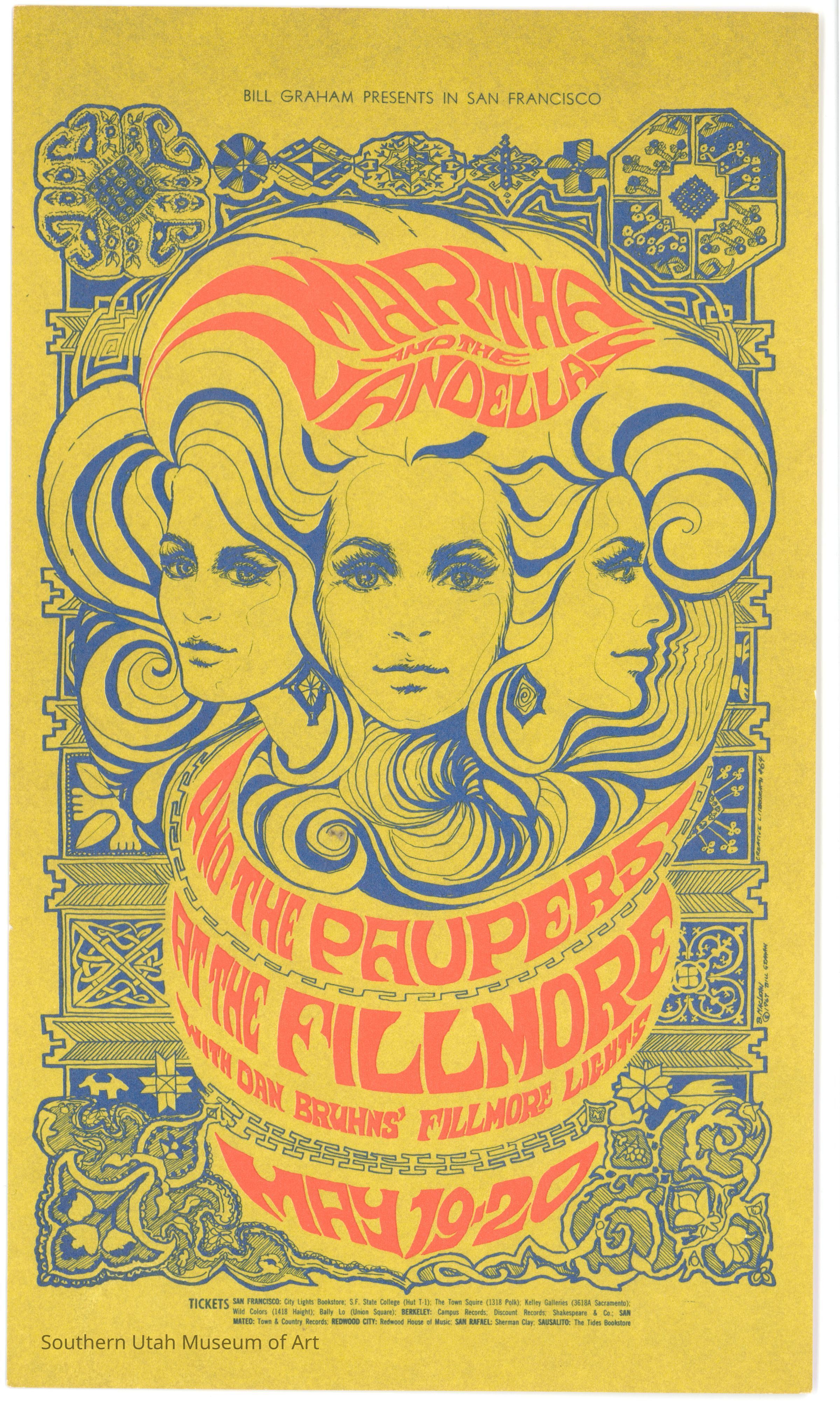 Bonnie MacLean was a devoted employee of the Fillmore West concert venue in the Haight-Ashbury district of San Francisco. She was integral to the day-to-day operations, including collecting tickets, passing out handbills, and counting money. Additionally, she drew on the chalkboards inside the Fillmore that presented that evening’s band lineup. MacLean developed the psychedelic style right alongside Wes Wilson, who designed the posters; however, because her work was ephemeral–being erased at the end of each gig–she wasn’t as widely acknowledged for her contributions to this artistic movement. Her work became more recognized when Wes Wilson parted ways with Fillmore West, and MacLean was offered the opportunity to create the posters. What sets MacLean’s style apart from the other artists is her emphasis on human faces and intricately detailed patterns.Label Type