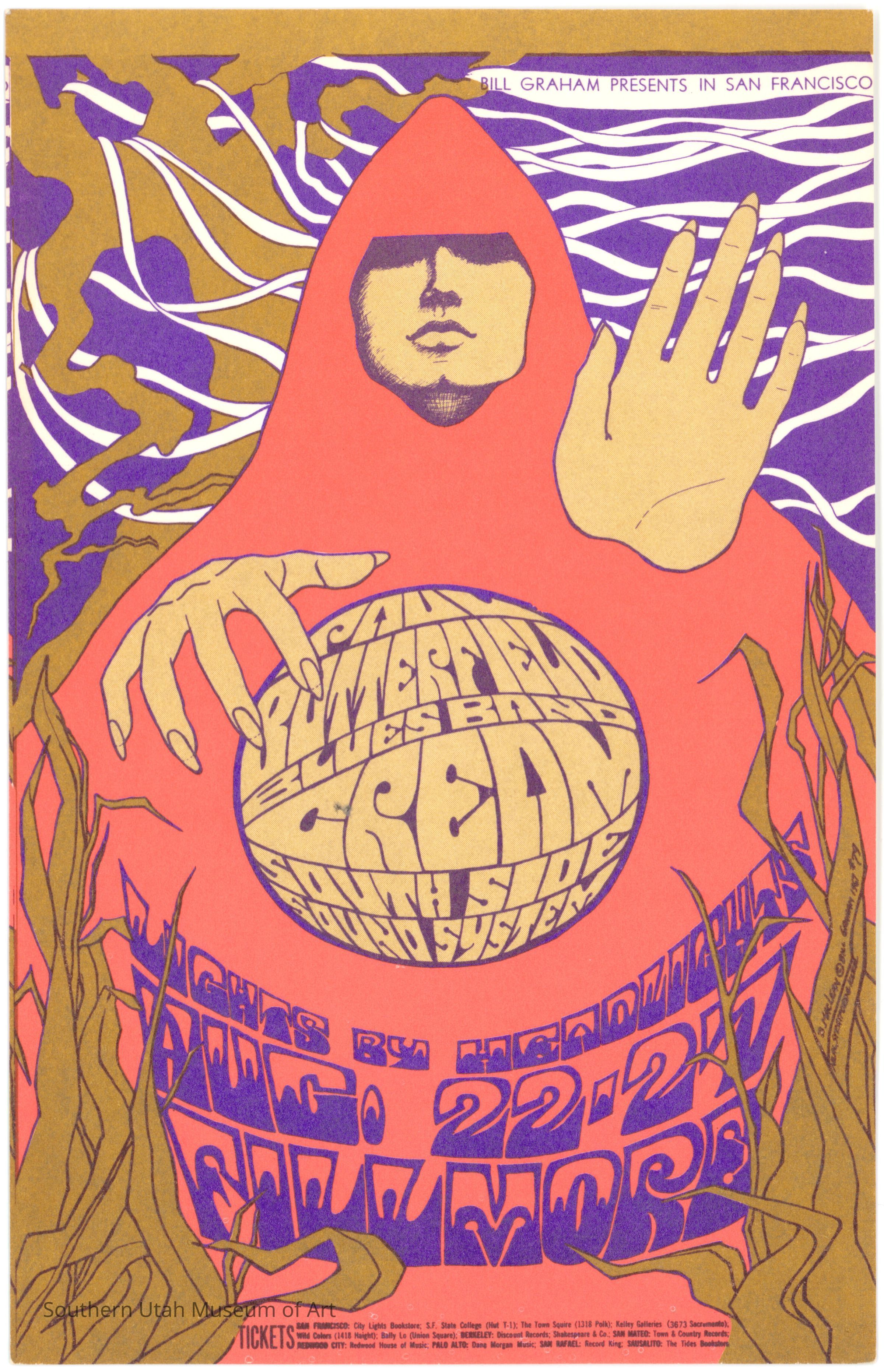 The Fillmore Auditorium employed many artists over the years, but MacLean was the only one to remain drug-free. Of her experience at the Fillmore she said, “I don’t think I ever felt like I quite fit in, but it didn’t really bother me.” Even though she remained sober, she still incorporated psychedelic imagery into her work. These influences appear in this design, in which the band names are contained inside a floating orb, seemingly controlled by a cloaked figure. Mysterious imagery, undulating words, and bright colors are trademarks of MacLean’s style.