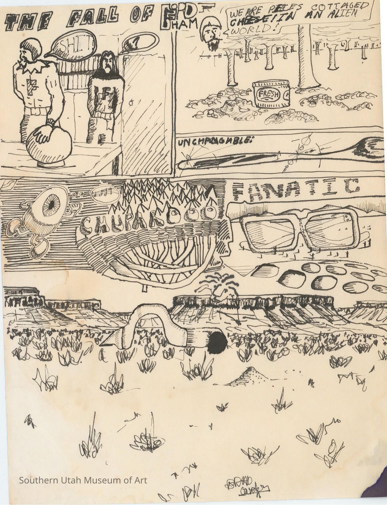 An ink drawing by Brad Gordon for Jim Jones. Drawing is part of a folder that was kept with the Jim Jones Scrapbook featuring artwork by students taught by Jim Jones.