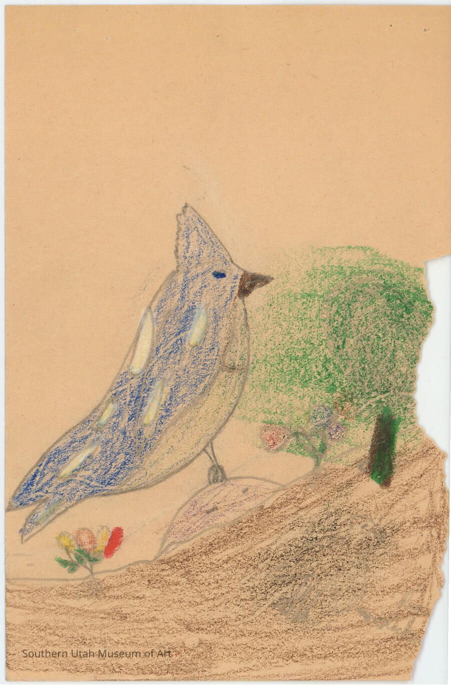 Crayon drawing of a bird completed by a young Jim Jones, most likely created while he was in elementary school. There is one bird drawn on the front and one bird drawn on the back of the paper.Collection