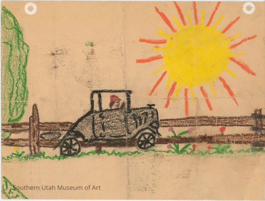 Crayon image of man driving car by a young Jim Jones, with man driving truck in penil on the back.
