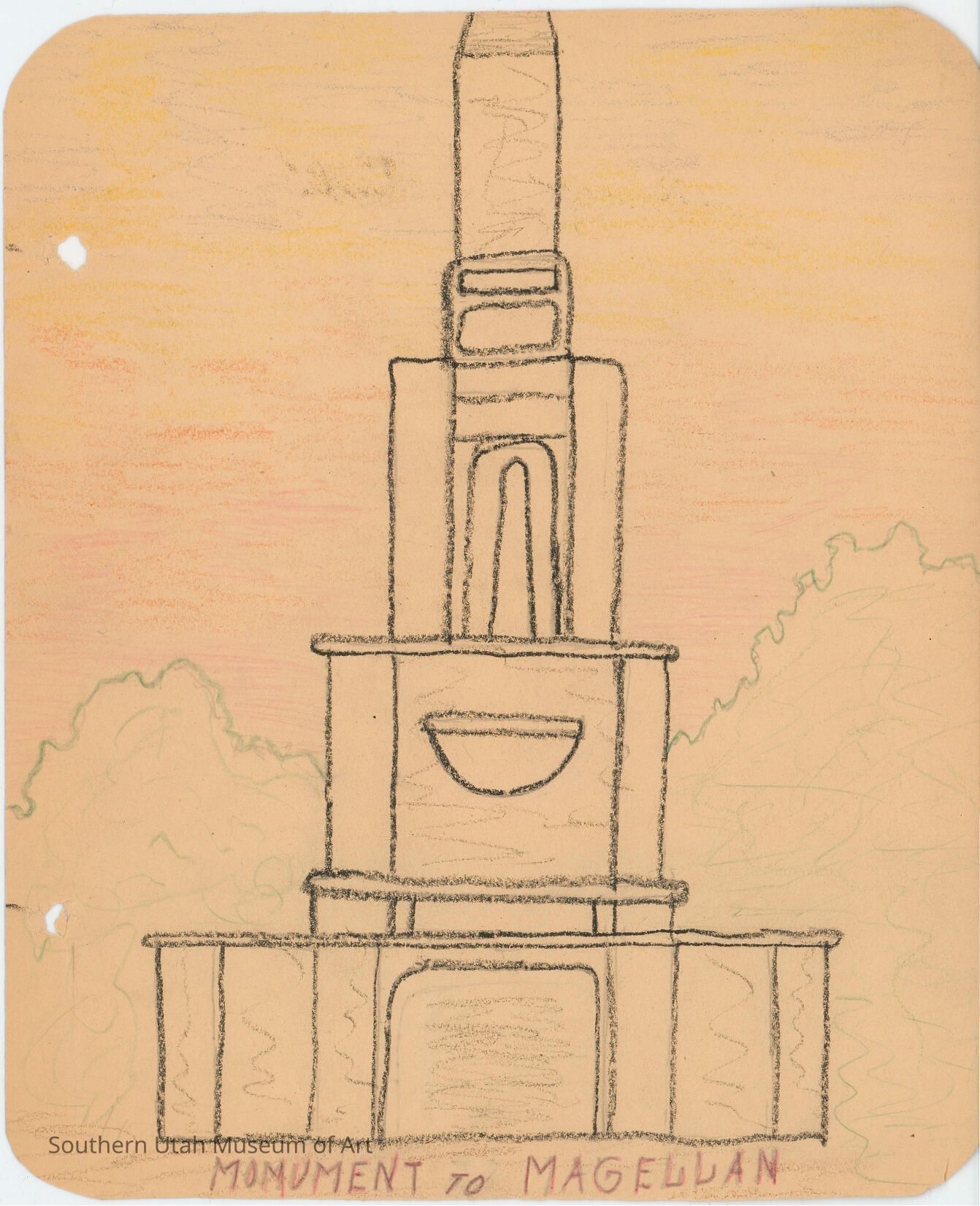 A crayon drawing of the "Monument to Magellan" by a young Jim Jones.