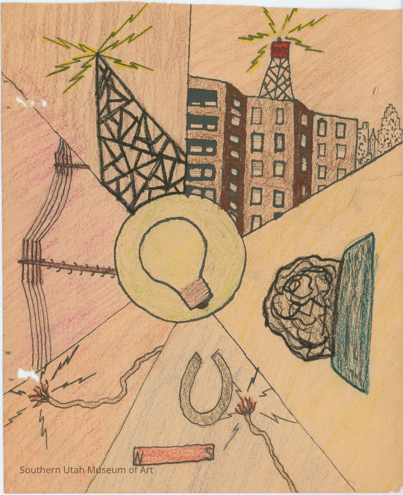 A crayon drawing of wires, a lightbulb, magnet, and a city scape by a young Jim Jones.