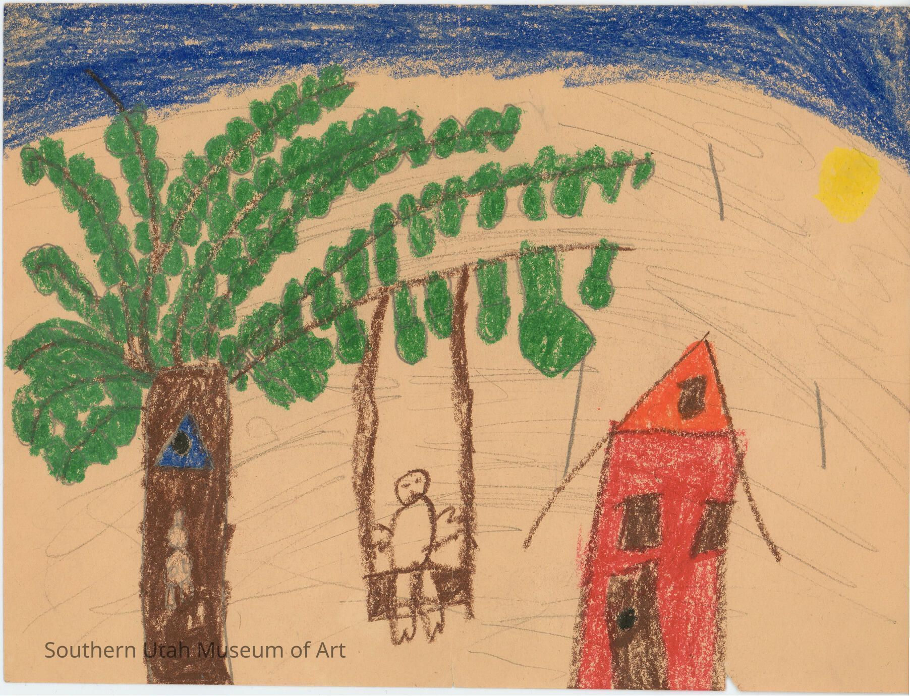 Crayon drawing of a tree, house and boy on a swing by a young Jim Jones.