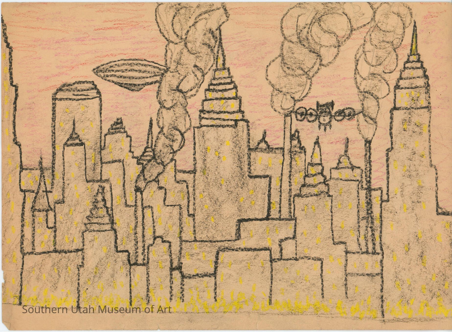 A crayon drawing of a city scape with smoke-stacks and a blimp; on the backside: a drawing of a city on fire by Jim Jones.