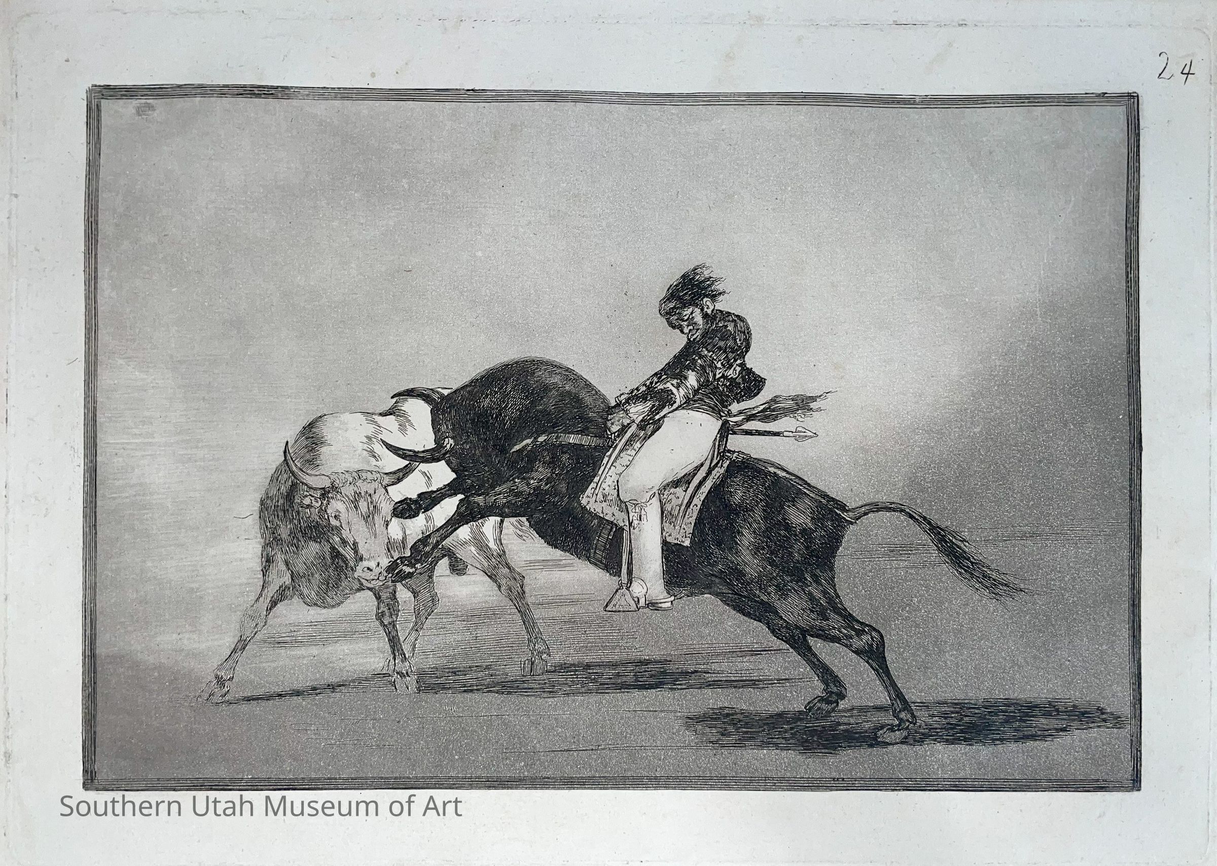 Translated into English, the title of this print reads: “The same Ceballos mounted on another bull breaks short spears in the ring at Madrid.” A part of the series La Tauromaquia, this print is one of 33 illustrating the history of bullfighting and the achievements of known bullfighters. Here, Goya depicts an epic feat by the torero (bullfighter) Mariano Ceballos, in which he confronts a bull while riding on another bull. The tonal variation of the background, which casts a shadow across the bottom, is the result of aquatint, an intaglio technique that achieves this effect by covering the metal printing plate with powdered rosin. When the areas not covered in rosin are exposed to acid, these differences in tonal values are created.