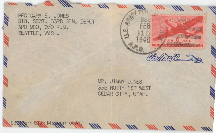 An envelope once containing a letter from Gary Jones to his younger brother Jim Jones while Gary was in the army during WWII and stationed in Seattle, Washington. The envelope is dated Febuary 15, 1946.Collection
