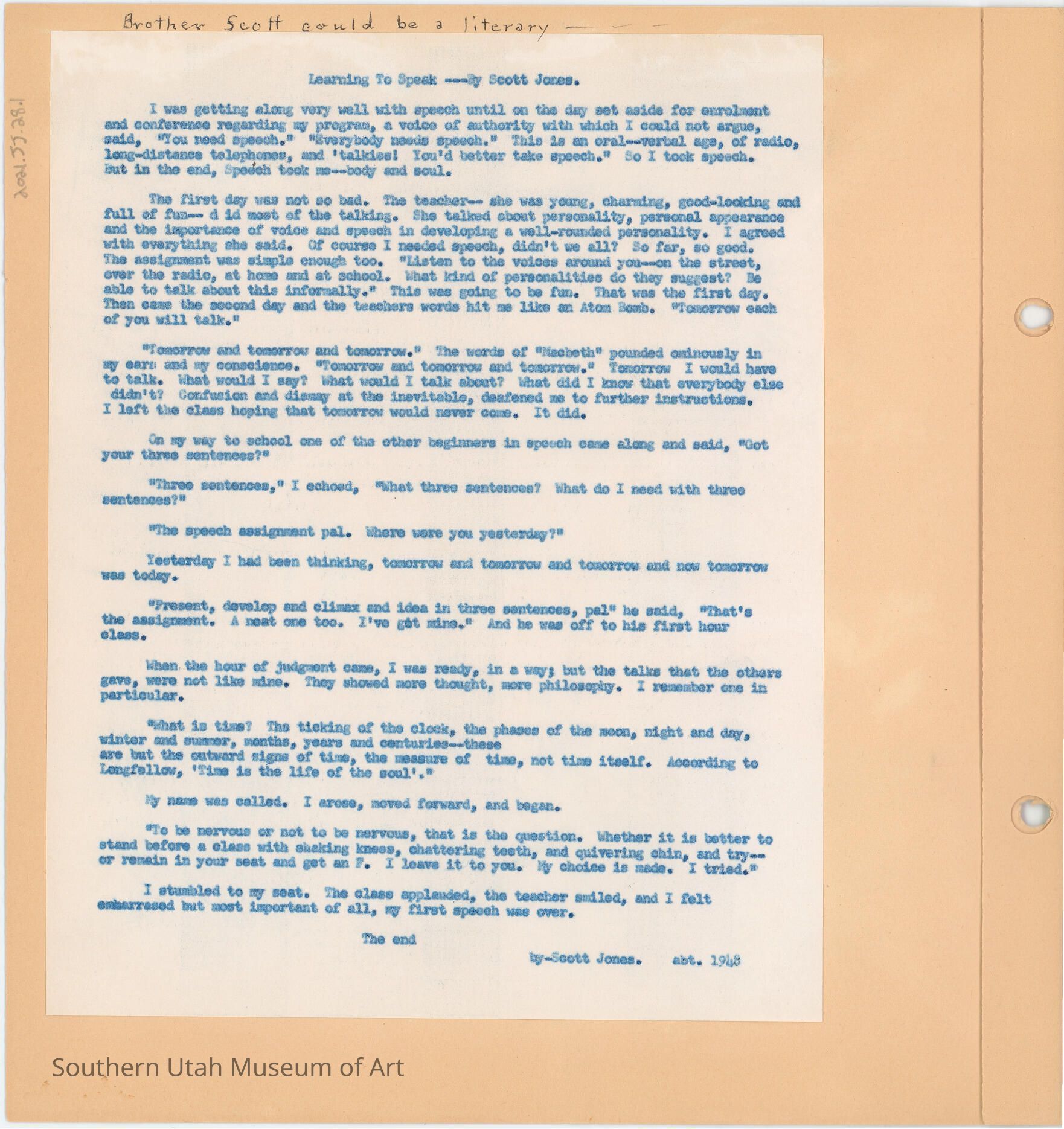 A page from the Jim Jones Scrapbook kept by his mother Thelma Jones. Pasted to the page is a short story by Jones' older brother Scott. Thelma wrote at the top: "Brother Scott could be a literary."Collection