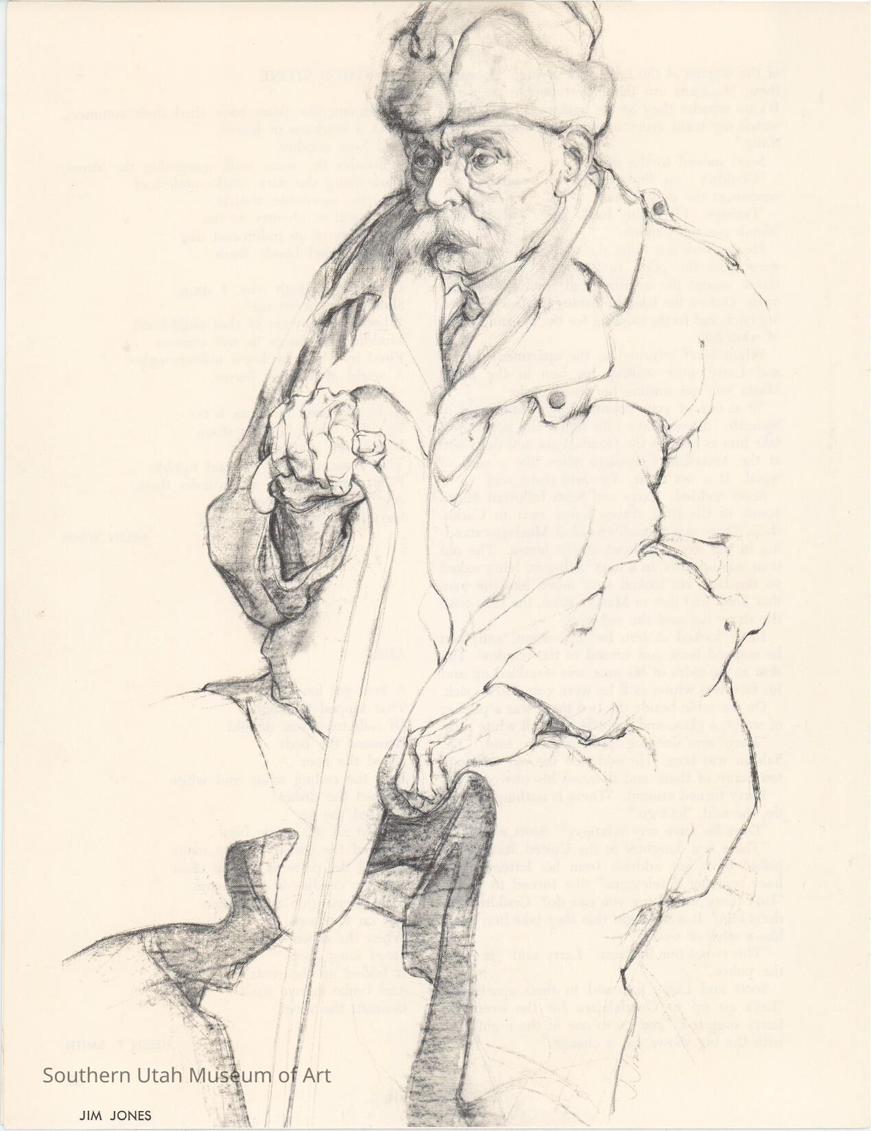 A drawing by Jim Jones printed in a literary review of an old man with a cane. Folio is part of a folder that was kept with the Jim Jones Scrapbook featuring artwork by students taught by Jim Jones.Collection