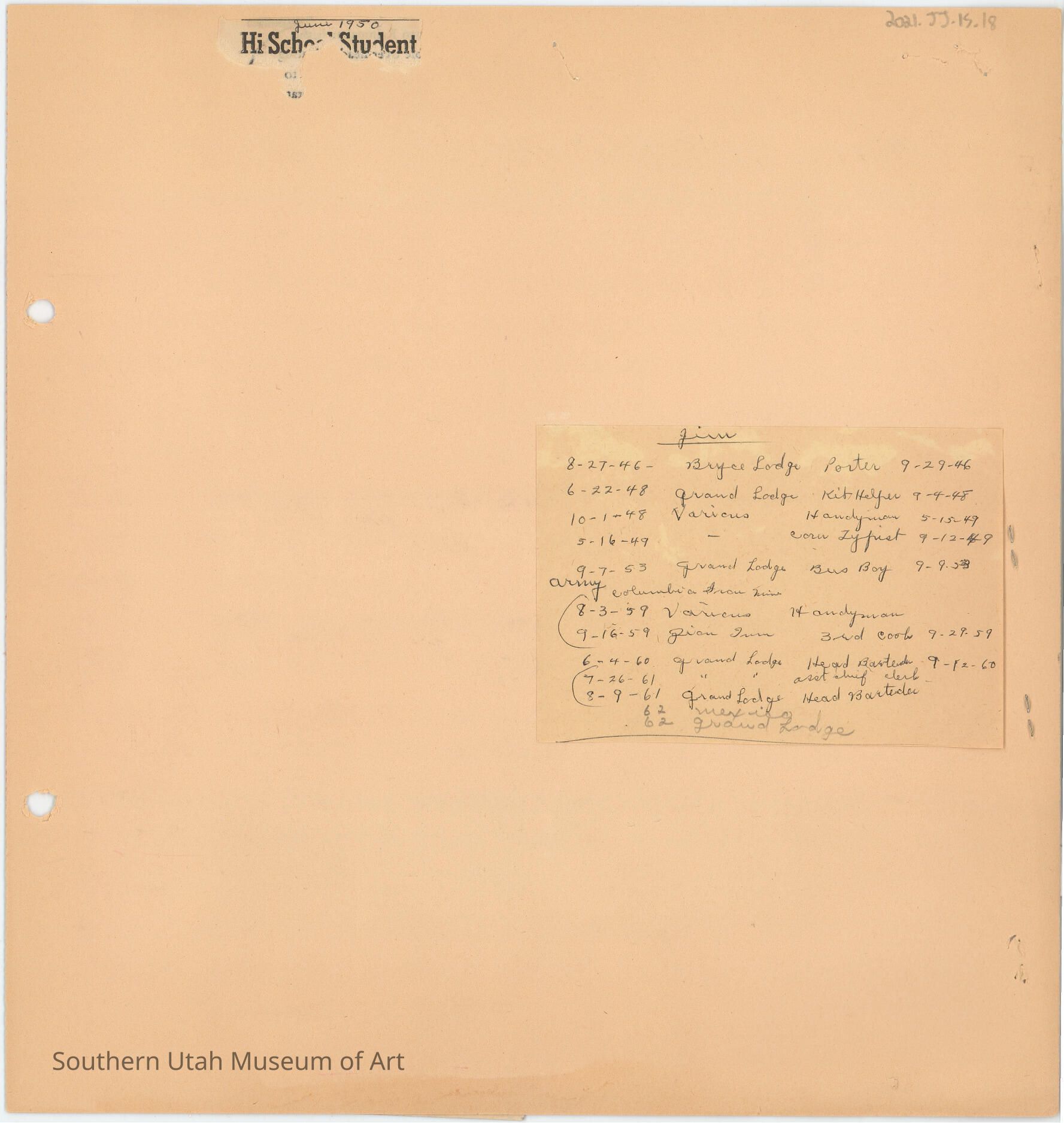 A page from the scrapbook kept by Jim Jones' mother Thelma Jones. A piece of paper with dates and job titles of every job Jim Jones held from 1946 until 1962, is pasted to the page.Collection