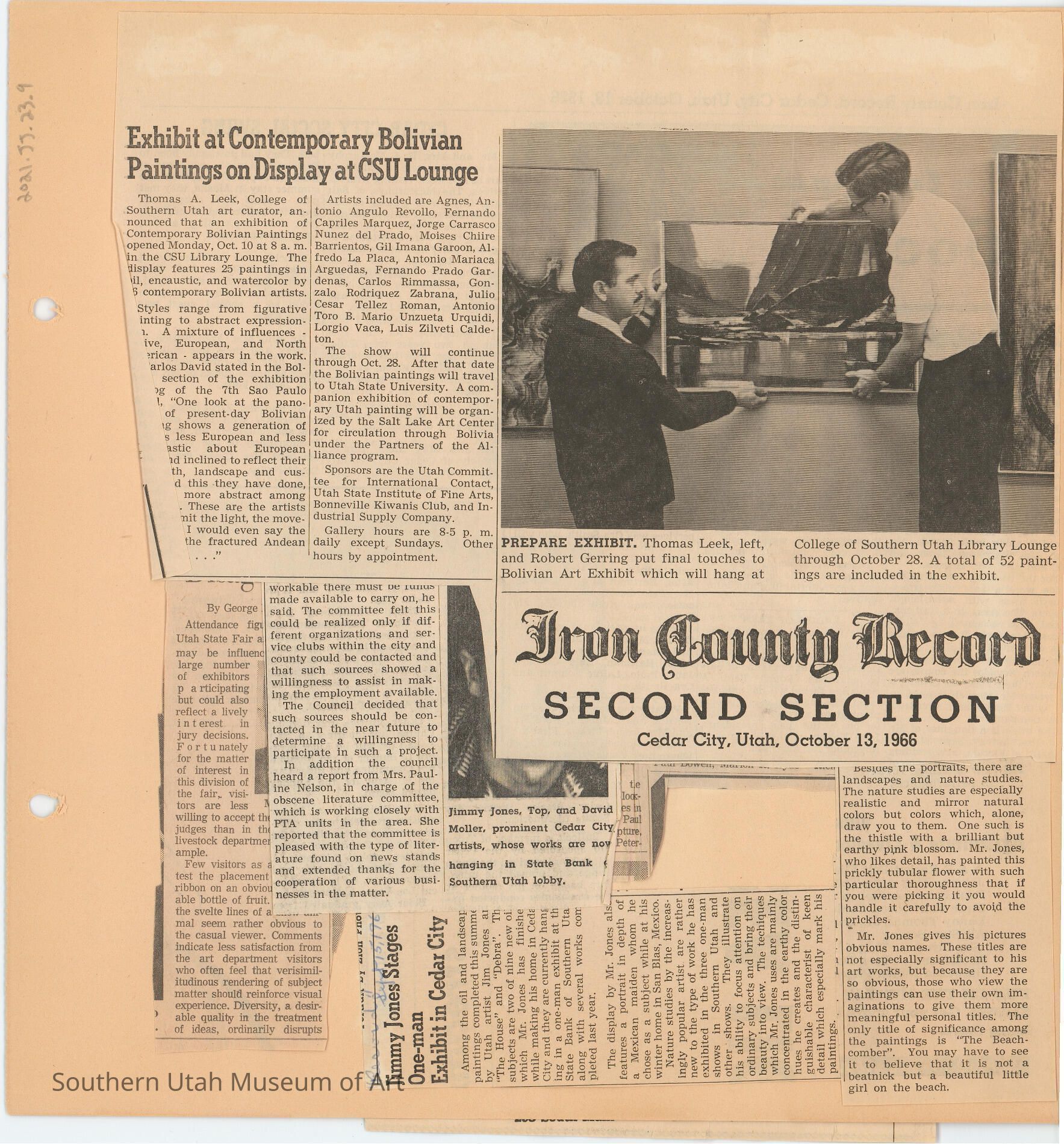 1. A newspaper clipping from the Iron County Record, dated October 13, 1966 highlights an exhibtion of contemporary Bolivian artists to be exhibted at the Library Lounge at College of Southern Utah, 1966.