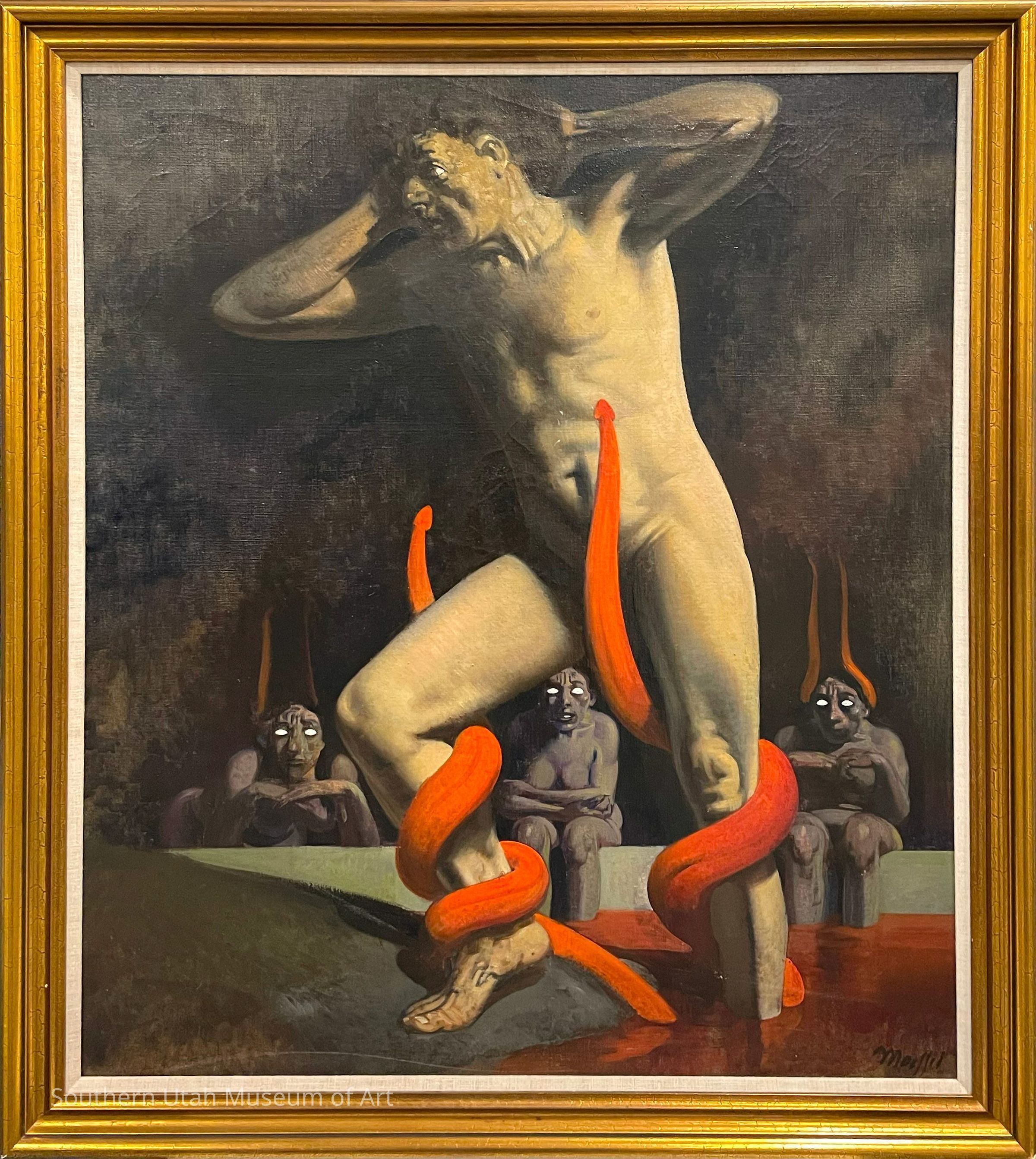 Serpent-like tentacles emerge from a blood-red pool, mirroring the horns of the demonic creatures who look on, as the human figure is trapped by them. The horns threaten to pull him inside as he slides down an incline. The demonic onlookers with writhing horns reappear in many of Moessel’s paintings to represent guilt and shame, with glowing eyes that pierce and accuse the afflicted character in the foreground.