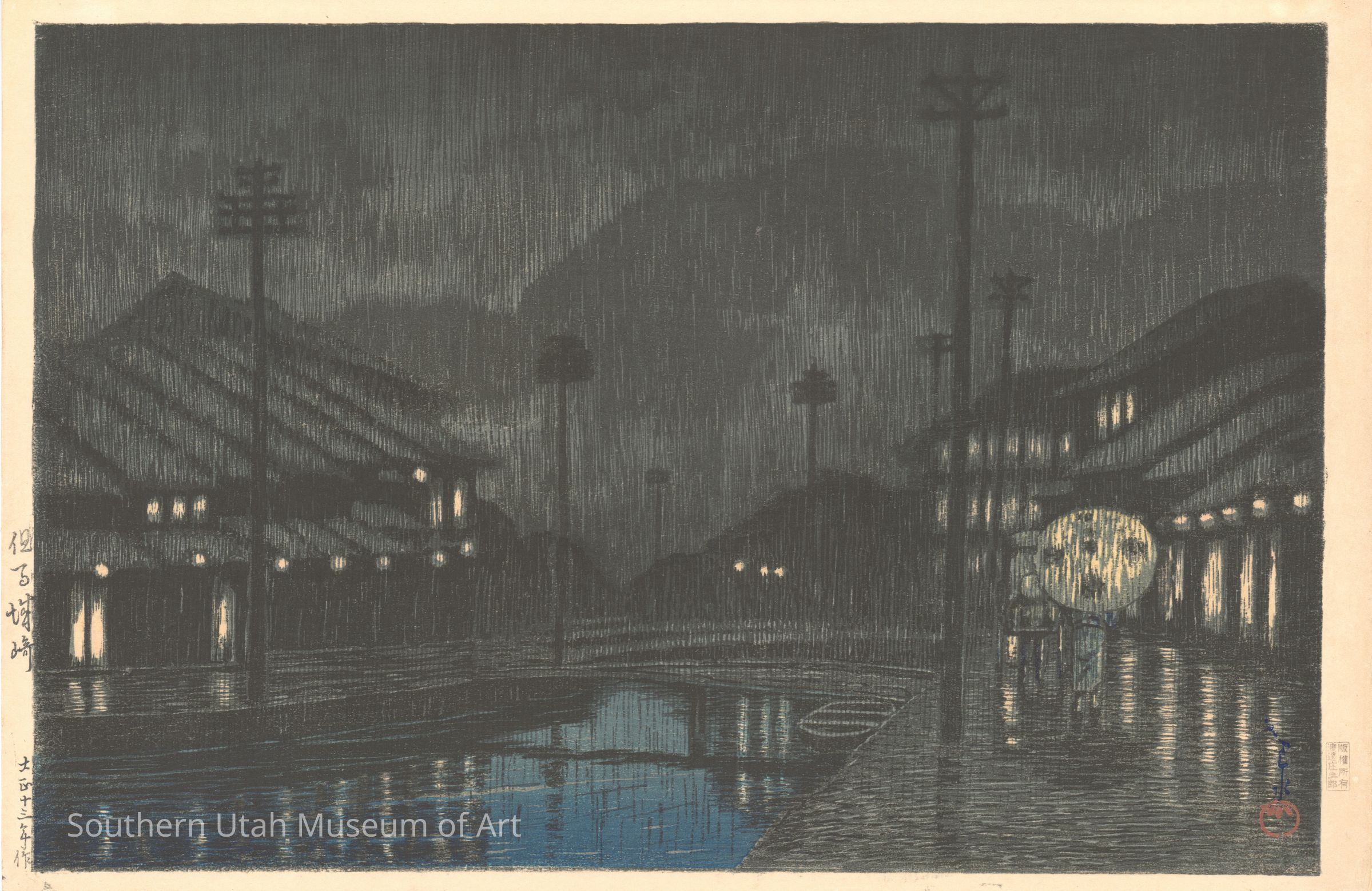 Kawase Hasui traveled frequently in order to sketch landscapes all over Japan. His popularity as an artist allowed him to print in series, and three series of “Souvenirs of Travel” were published. This particular print depicts the resort town of Kinosaki, known for its hot springs, during a nighttime rainstorm.