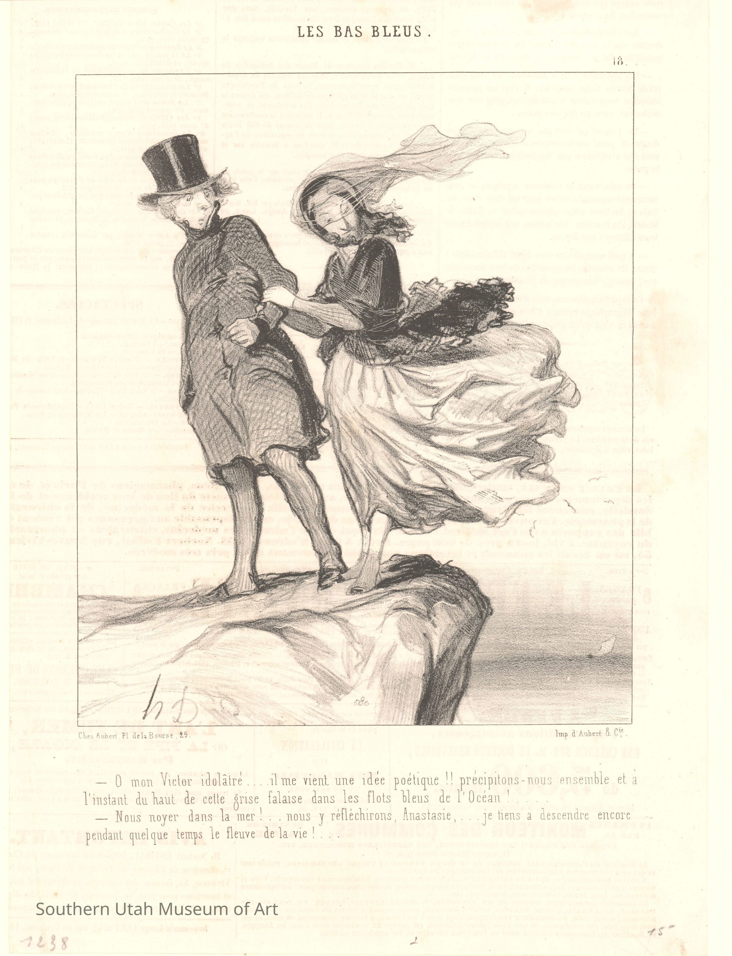 Les Bas-bleus translates to The Bluestockings, a term for educated, intellectual women. The original term referred to a member of the Blue Stockings Society of England, but in France it was often used with negative connotation. Daumier’s series Les Bas-bleus ridiculed the feminists of the day for neglecting their societal role as wives and mothers, and for presenting as unfeminine. This series of forty prints was published by Le Charivari; his print appeared on page 18.