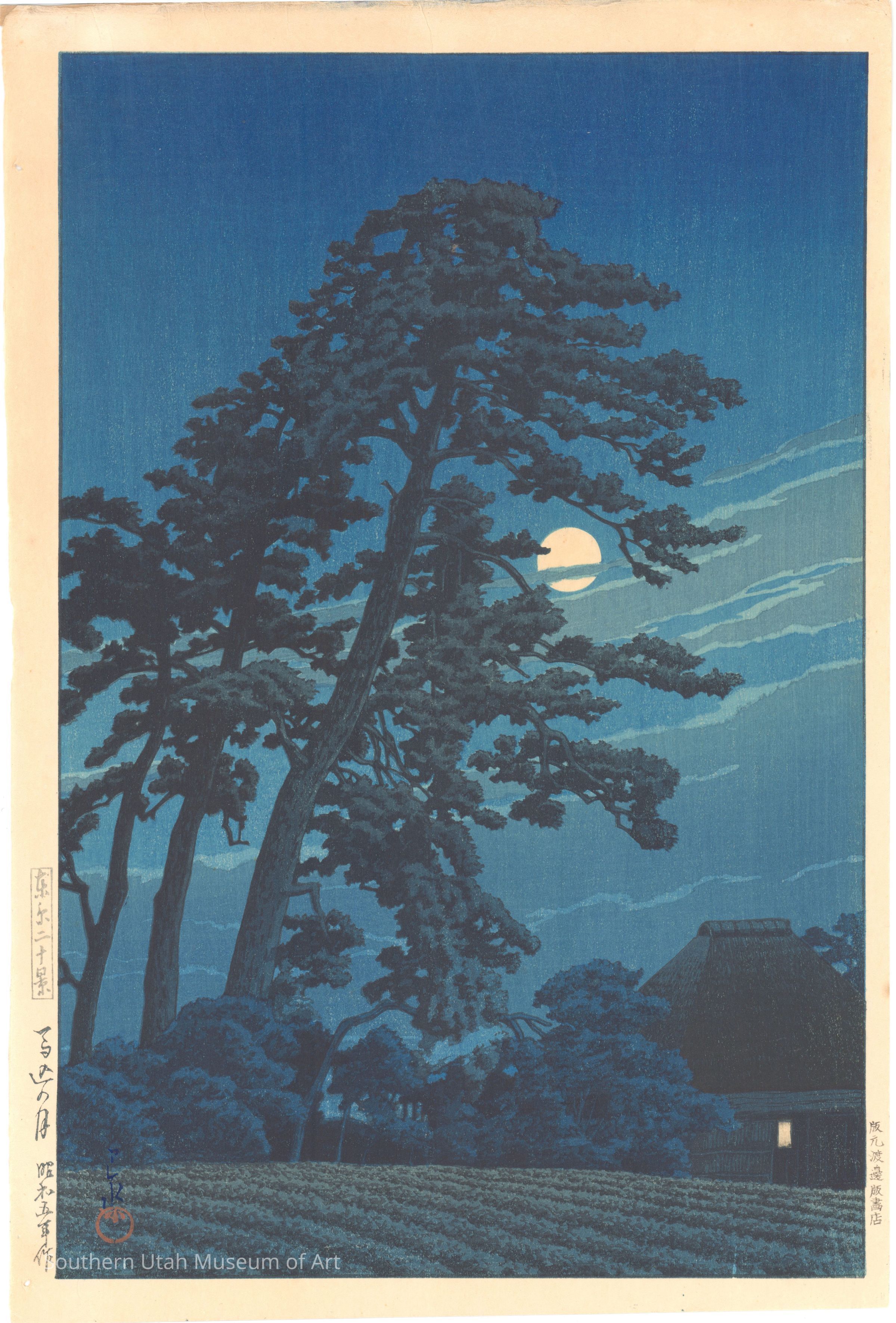 Hasui was a participant in shin-hanga (new prints): a Japanese art movement in the early 20th century that revitalized traditional ukiyo-e art and preserved the commercial, publisher-centered system of producing woodblock prints. Because Hasui’s role was to create designs that would be profitable to his publisher, they had to be universally appealing. This particular print illustrates Hasui’s talent for creating an elegant, yet intriguing landscape. The full moon partially obscured by mysterious clouds, the tree branches that seem like fingers reaching down, and the light-filled window of a solitary home all invite the viewer to let their imagination expand the narrative of the scene.