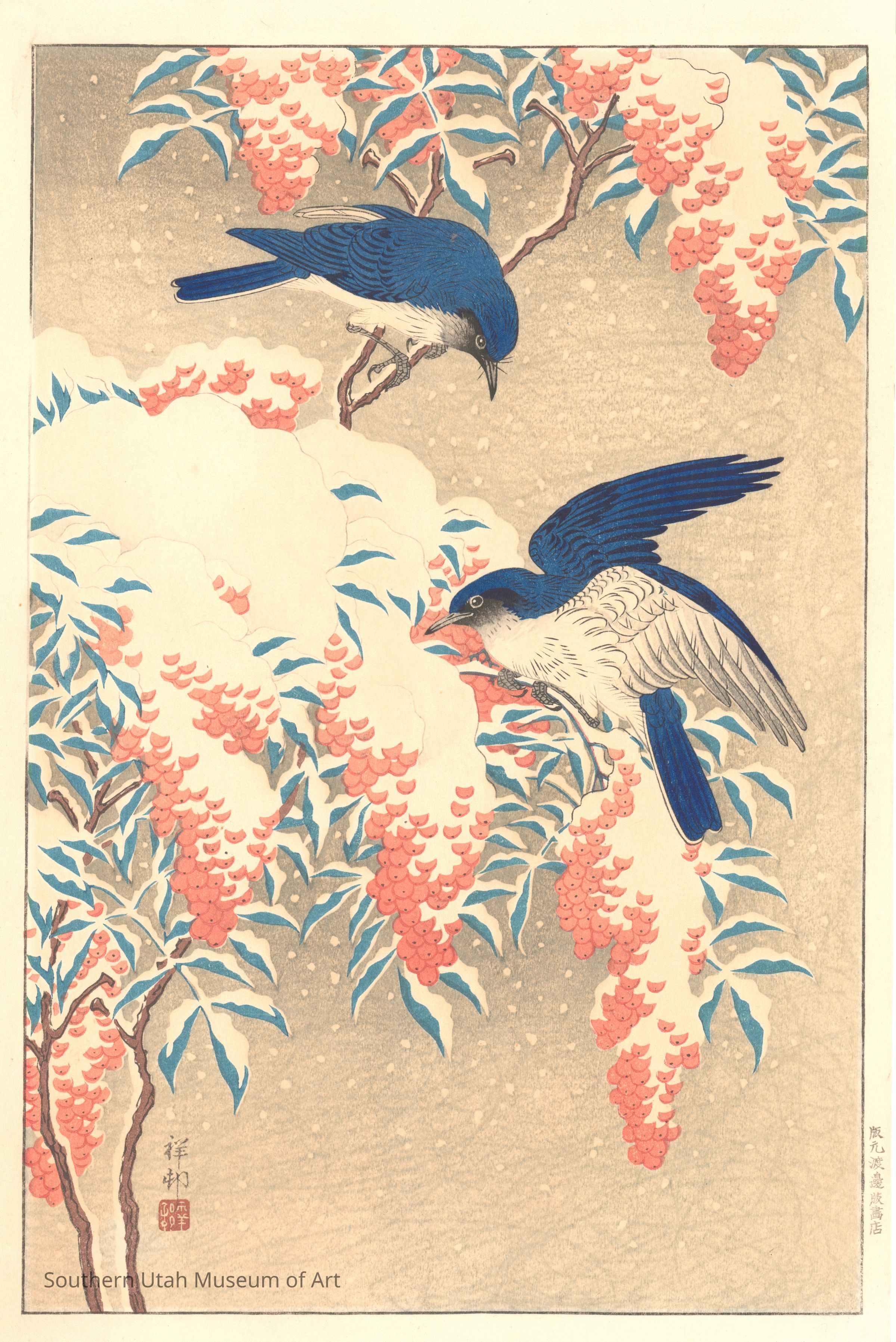 Kacho-e is a subgenre of ukiyo-e that focuses primarily on the study of birds and flowers. While many Western artists depicted wildlife for the purpose of description and classification, kacho-e artists were concerned with the experience and emotion associated with seeing these subjects in nature. Shôson was one of the great masters of this trend, and this print depicts a snow-covered red Nanten bush and vibrant blue Flycatcher birds.