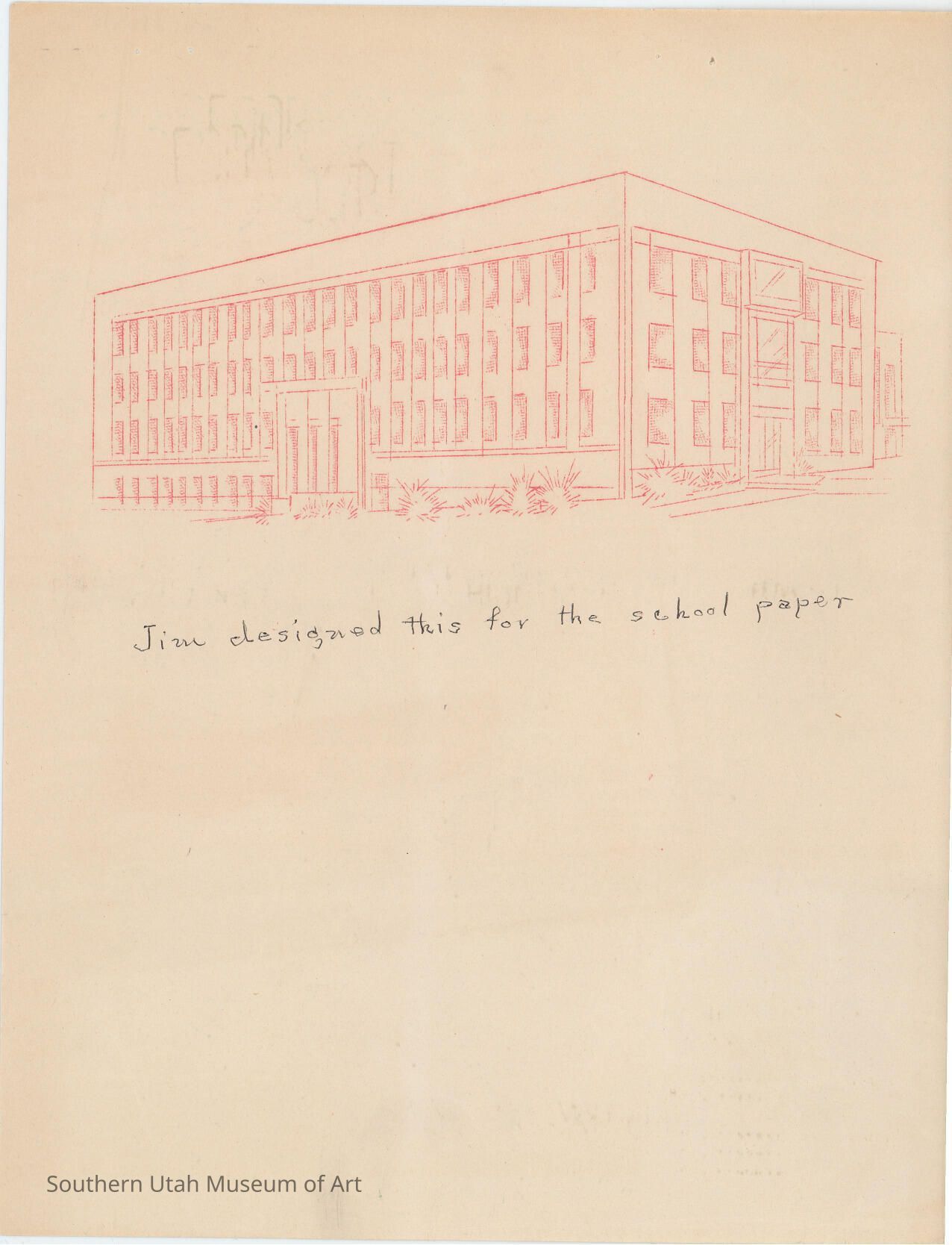 A print of a drawing Jim Jones' made of his high school for the the school newspaper The Cedar Post. The artist's mother, Thelma Jones, wrote under the print: "Jim designed this for the school paper."Collection