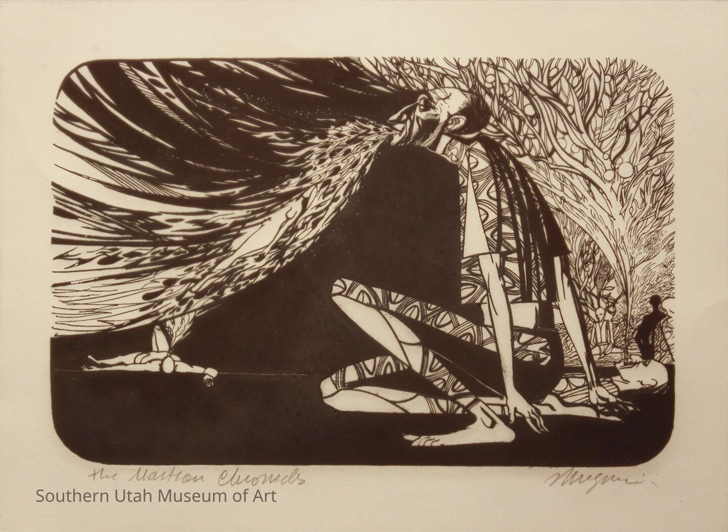 Joseph Mugnaini attended the Otis Art Institute in Los Angeles from 1940 to 1942, before serving in the U.S. Army during World War II. After his discharge, Mugnaini returned to Otis Art Institute on the G.I. Bill and three months later he joined the faculty, eventually becoming head of the Drawing Department. Although he is the author of five books on art techniques and materials, he is best known as being the primary illustrator of the science fiction books by Ray Bradbury. Mugnaini earned an Academy Award nomination and the Golden Eagle Award for his paintings for the film "Icarus," a Bradbury collaboration. This piece could be an illustration for Ray Bradbury's book "The Martian Chronicles." A similar work, nearly identical except for being in reverse and entitled "The Insane Asylum," was owned by Ray Bradbury.