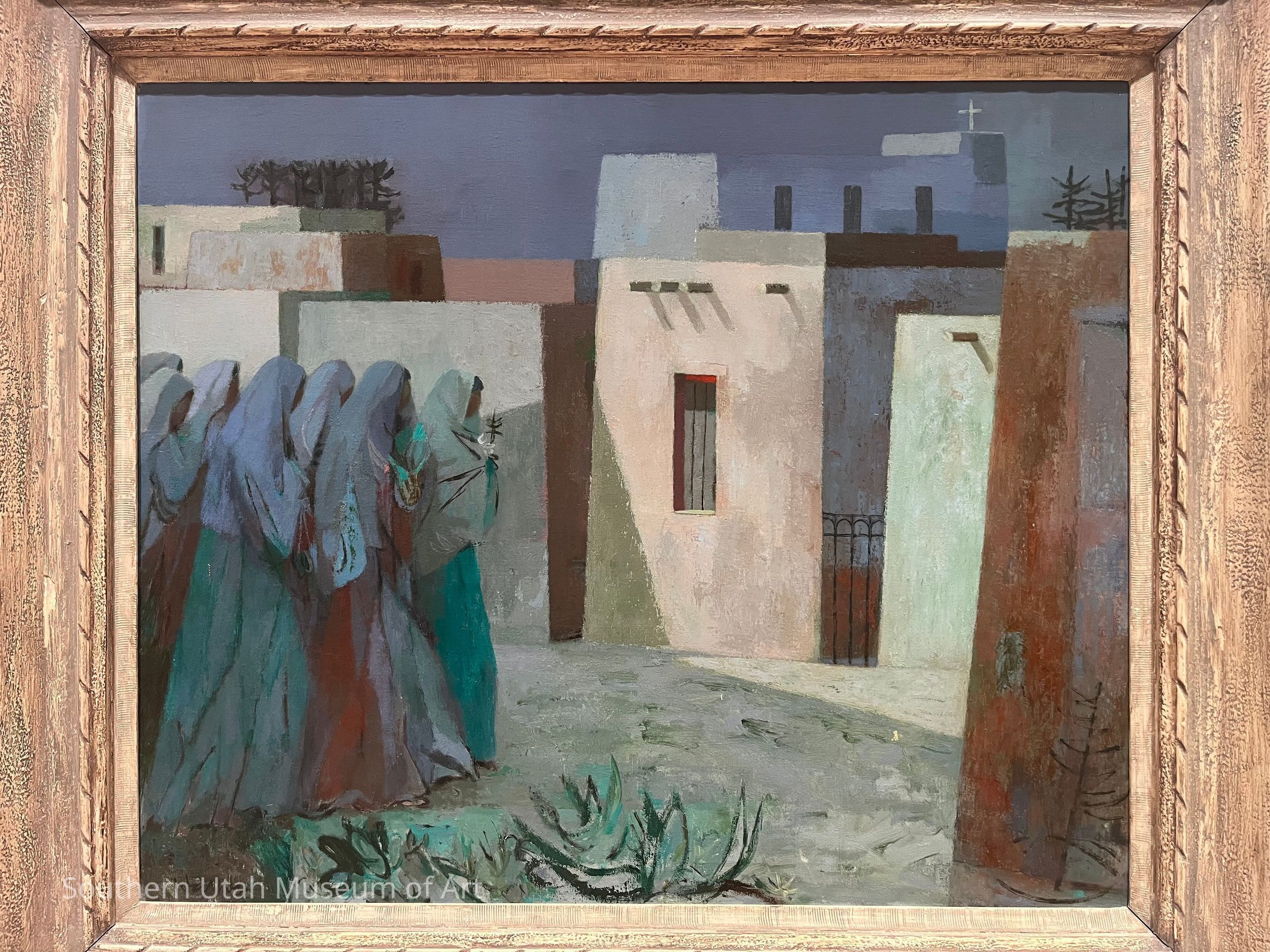 Richard Haines is perhaps best-known as a muralist; and the influence of this medium can be seen in his use of space in The Processional. The painting uses muted colors of a similar color palette, and the people are faceless, lacking even the most basic of expressions. Because of this, the primary form of expression is through space and the way in which the figures and buildings fit within the painting. The procession of people occupies the foreground and lower left corner of the painting. Through this placement, you can feel the women’s direct relation to the mounted white cross in the distance. Separating the procession and the church are strong and more brightly lit buildings that create a maze, through which the women will have to wander to reach their destination.
